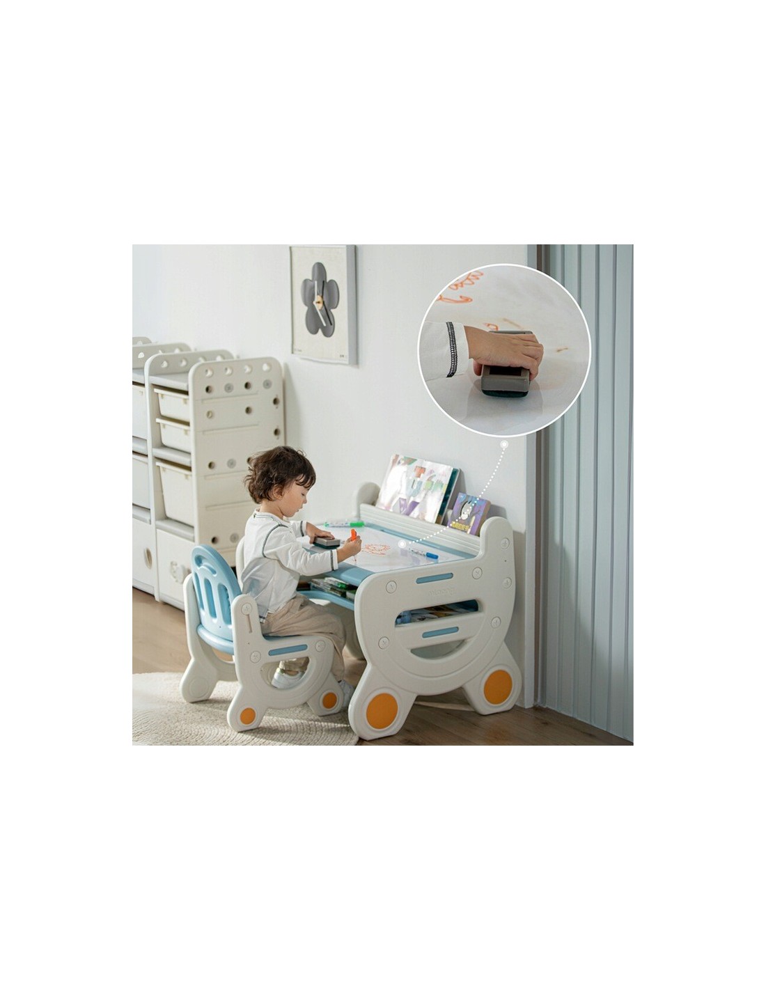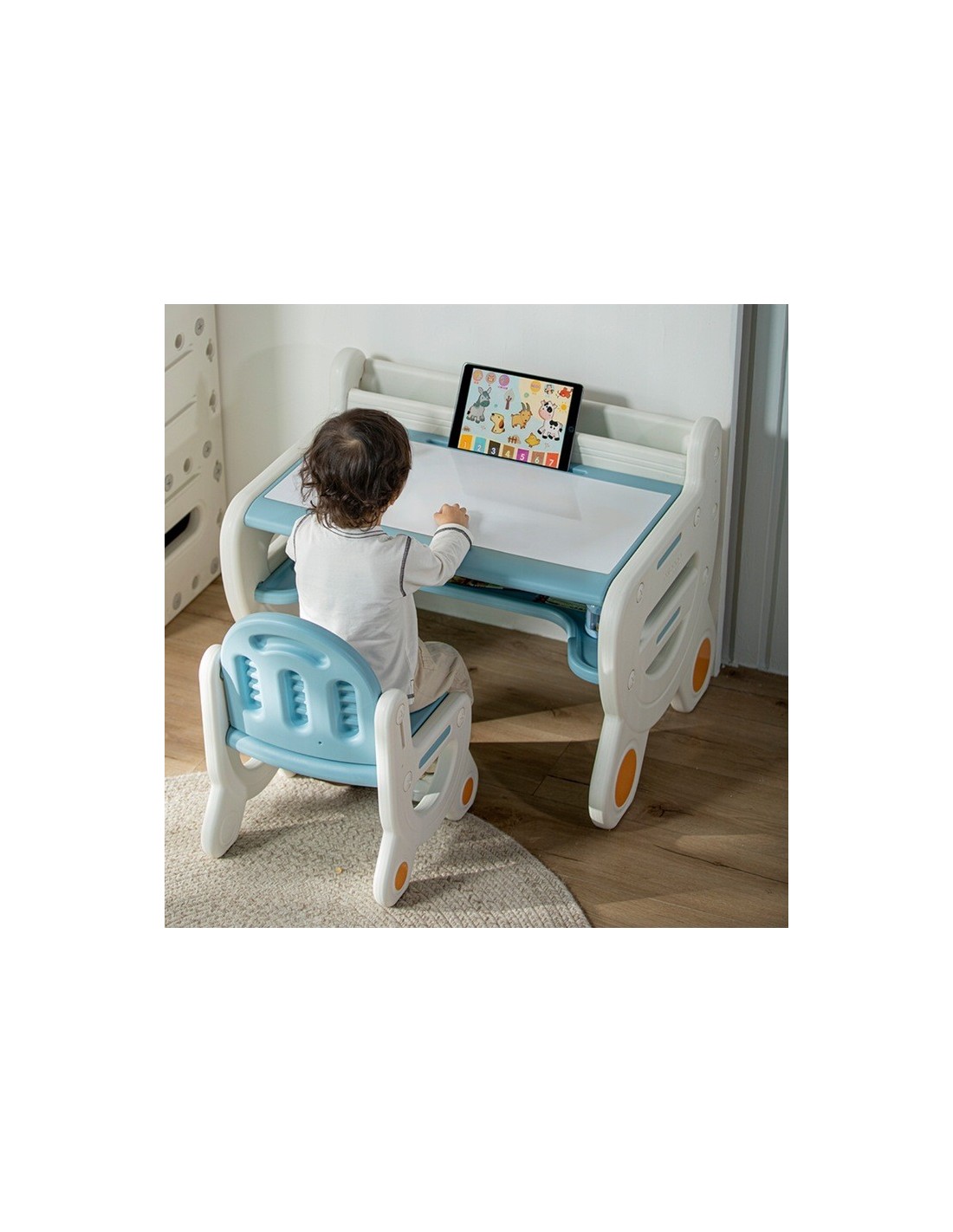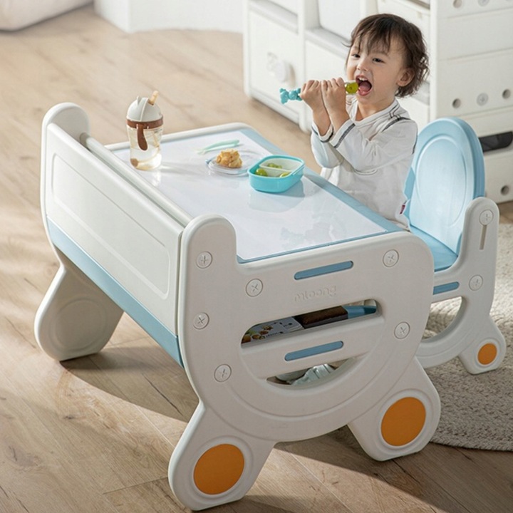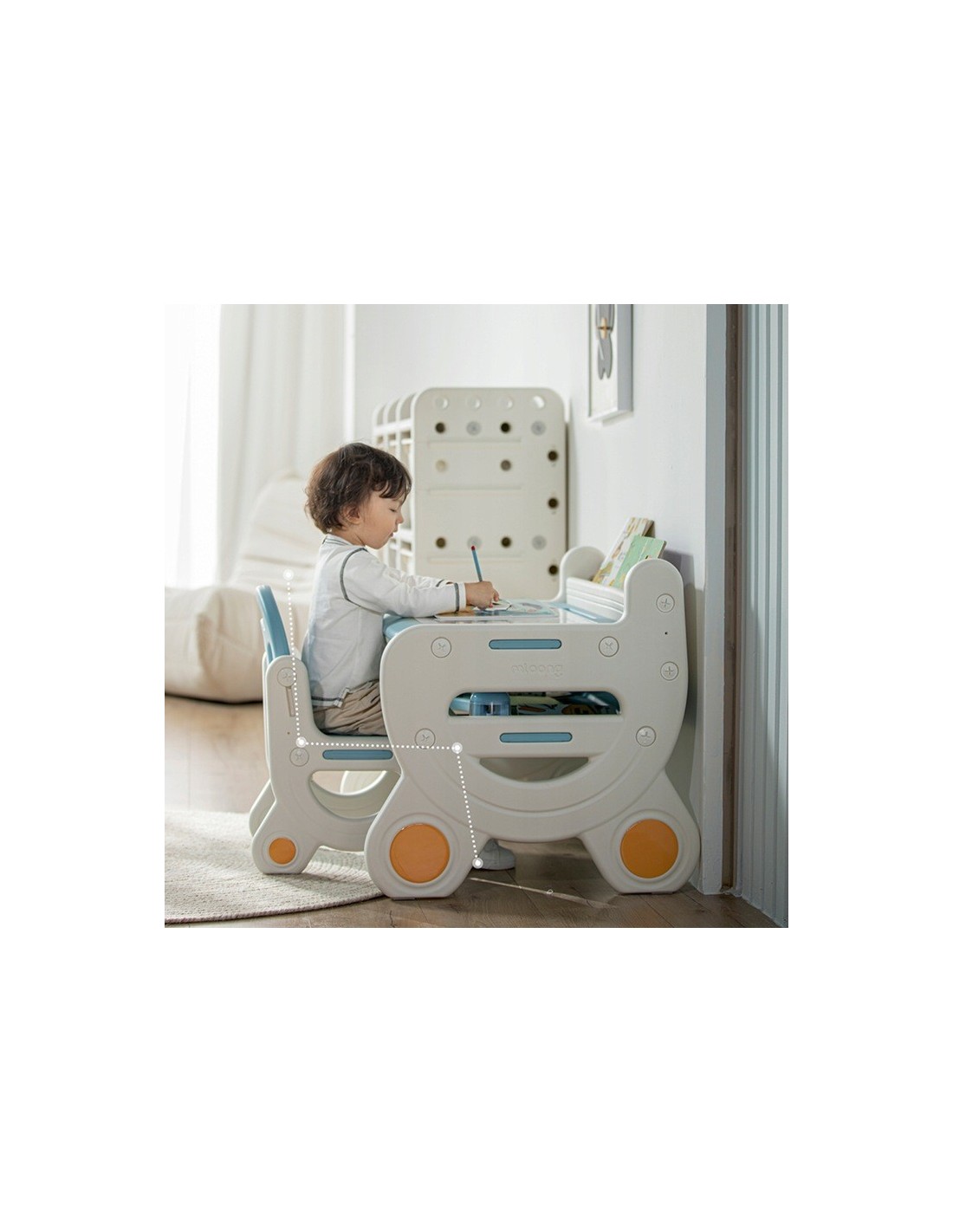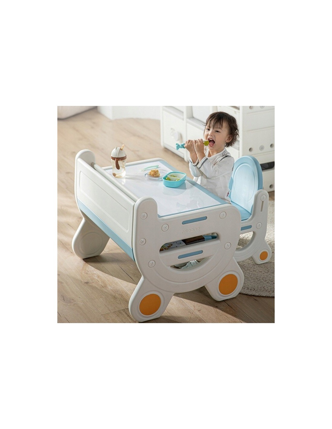 Die integrierte Ablage unter dem Tisch schafft Platz für Marker, Bücher und Spielzeug – alles ordentlich und griffbereit. Die glatte Oberfläche ist besonders pflegeleicht. Dank des leichten Gewichts lässt sich der Tisch mühelos von Raum zu Raum bewegen – perfekt für flexibles Familienleben.