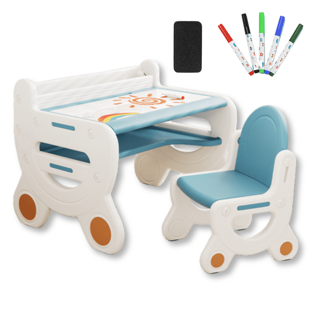 Die Tischplatte dient als abwischbares Whiteboard, auf dem Kinder mit den beiliegenden Stiften schreiben und malen können – immer wieder neu. Ideal zum Üben von Buchstaben, Zahlen und Formen. Im Set enthalten: 5 farbige Marker und ein Schwamm – für sofortigen Spielspaß ohne zusätzliche Käufe.