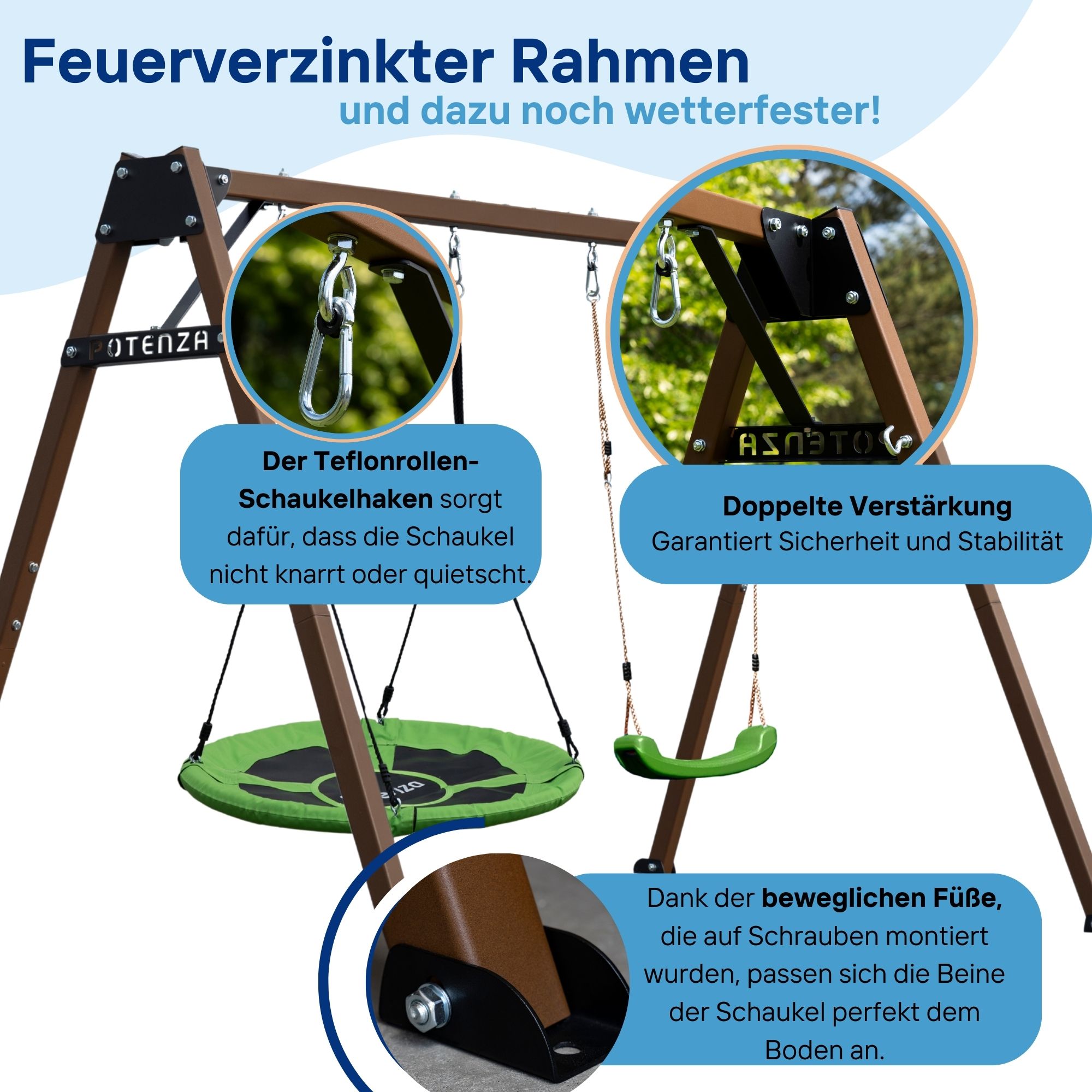 • Teflon-Schaukelhaken verhindern Knarren und Quietschen und sorgen für besonders leises Schaukeln.