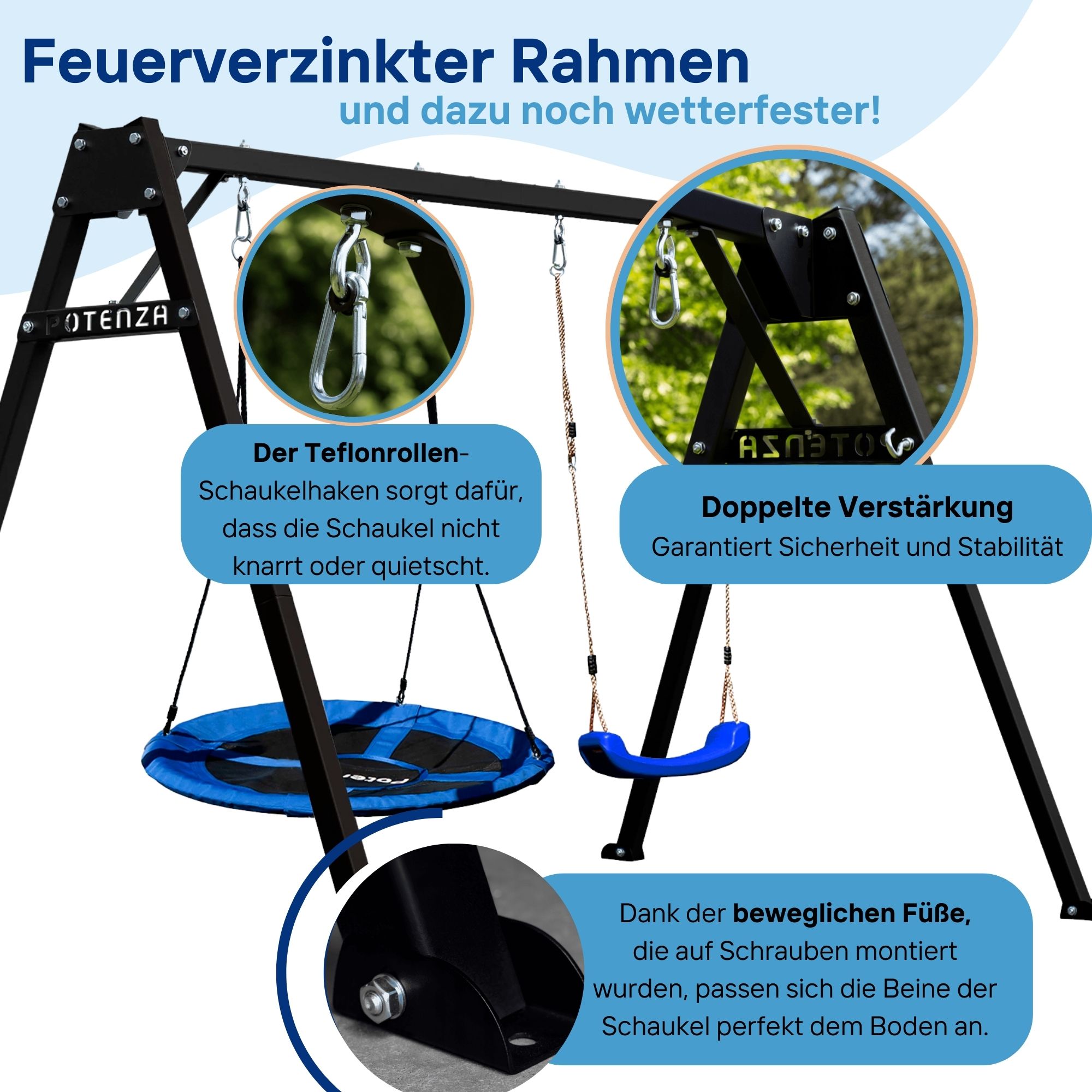 • Teflon-Schaukelhaken verhindern Knarren und Quietschen und sorgen für besonders leises Schaukeln.