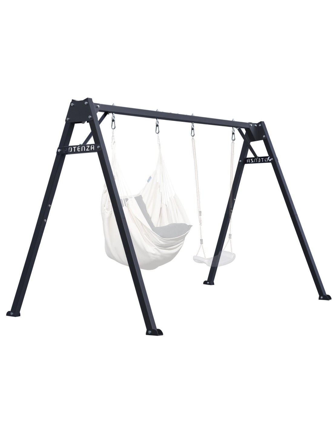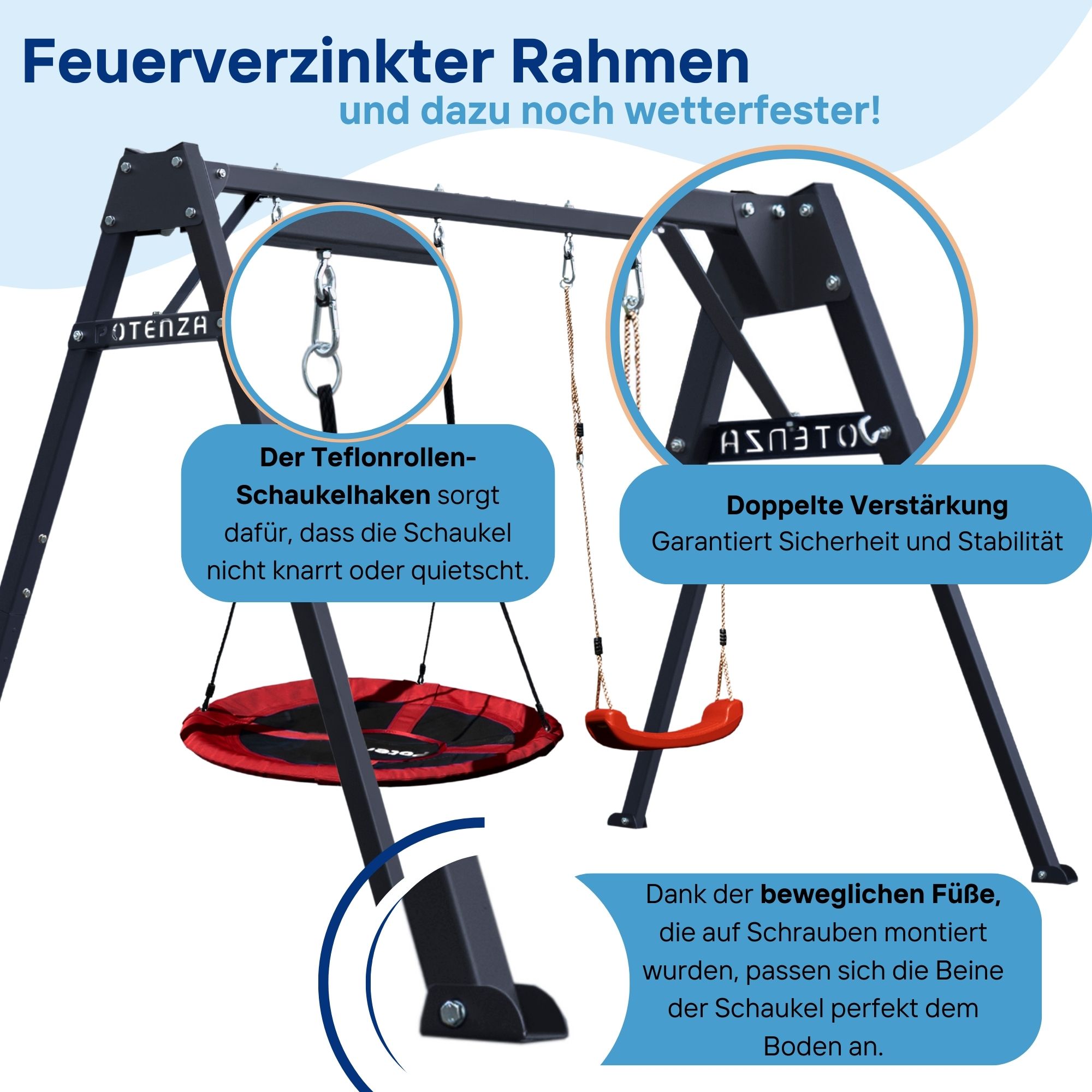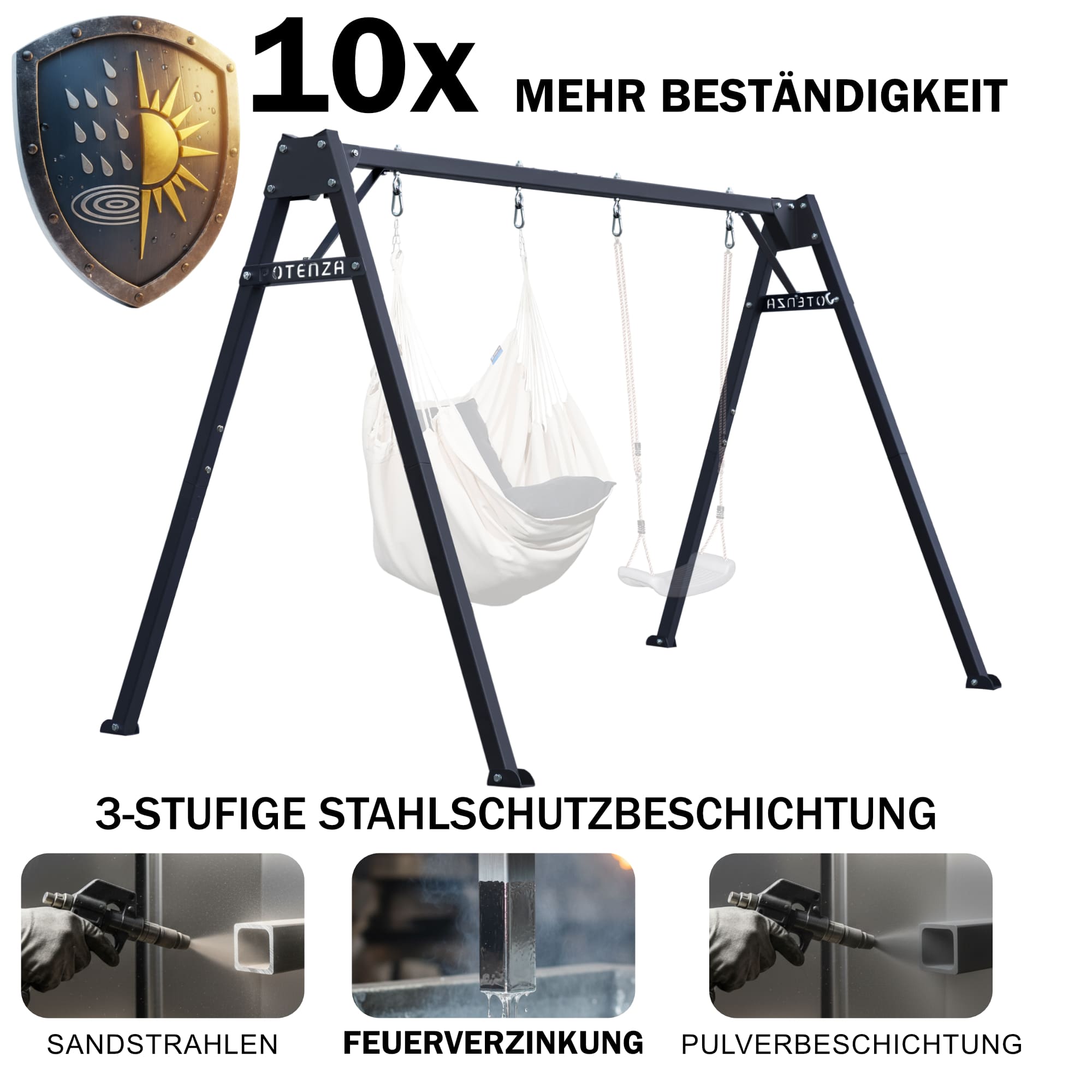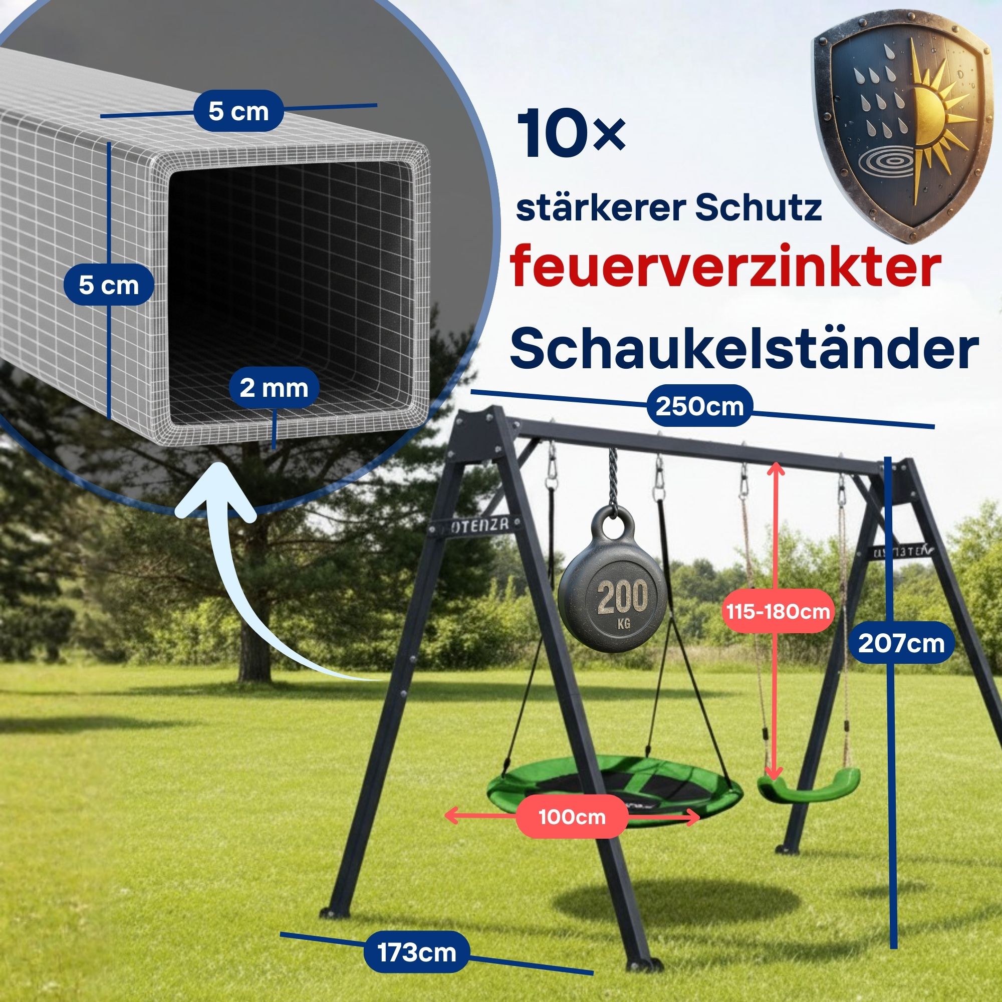 Stabiler Schaukelrahmen – wir sparen nicht am Stahl. Gefertigt aus robustem Stahlprofil mit 2 mm Wandstärke bietet der Rahmen hohe Belastbarkeit und dauerhafte Formstabilität – auch bei intensiver Nutzung. Mit einem Gewicht von 45 kg steht das Gestell für solide und zuverlässige Verarbeitung.