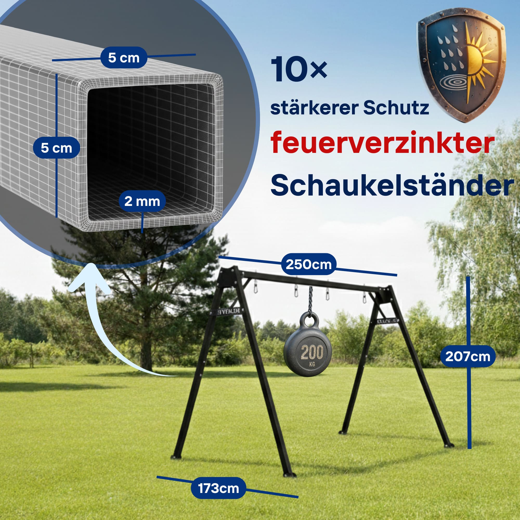 Stabiler Schaukelrahmen – wir sparen nicht am Stahl. Gefertigt aus robustem Stahlprofil mit 2 mm Wandstärke bietet der Rahmen hohe Belastbarkeit und dauerhafte Formstabilität – auch bei intensiver Nutzung. Mit einem Gewicht von 45 kg steht das Gestell für solide und zuverlässige Verarbeitung.