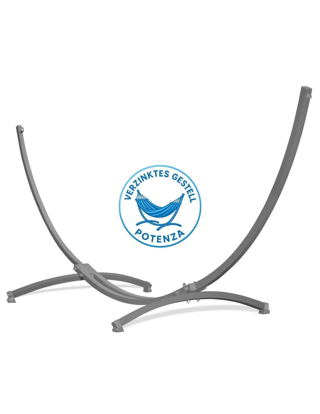 Das große, feuerverzinkte Grande-Gestell eignet sich hervorragend für große Gärten. Es hat eine Länge von 370 cm, wodurch es perfekt für große Doppelhängematten mit einer maximalen Länge von 340 cm geeignet ist.