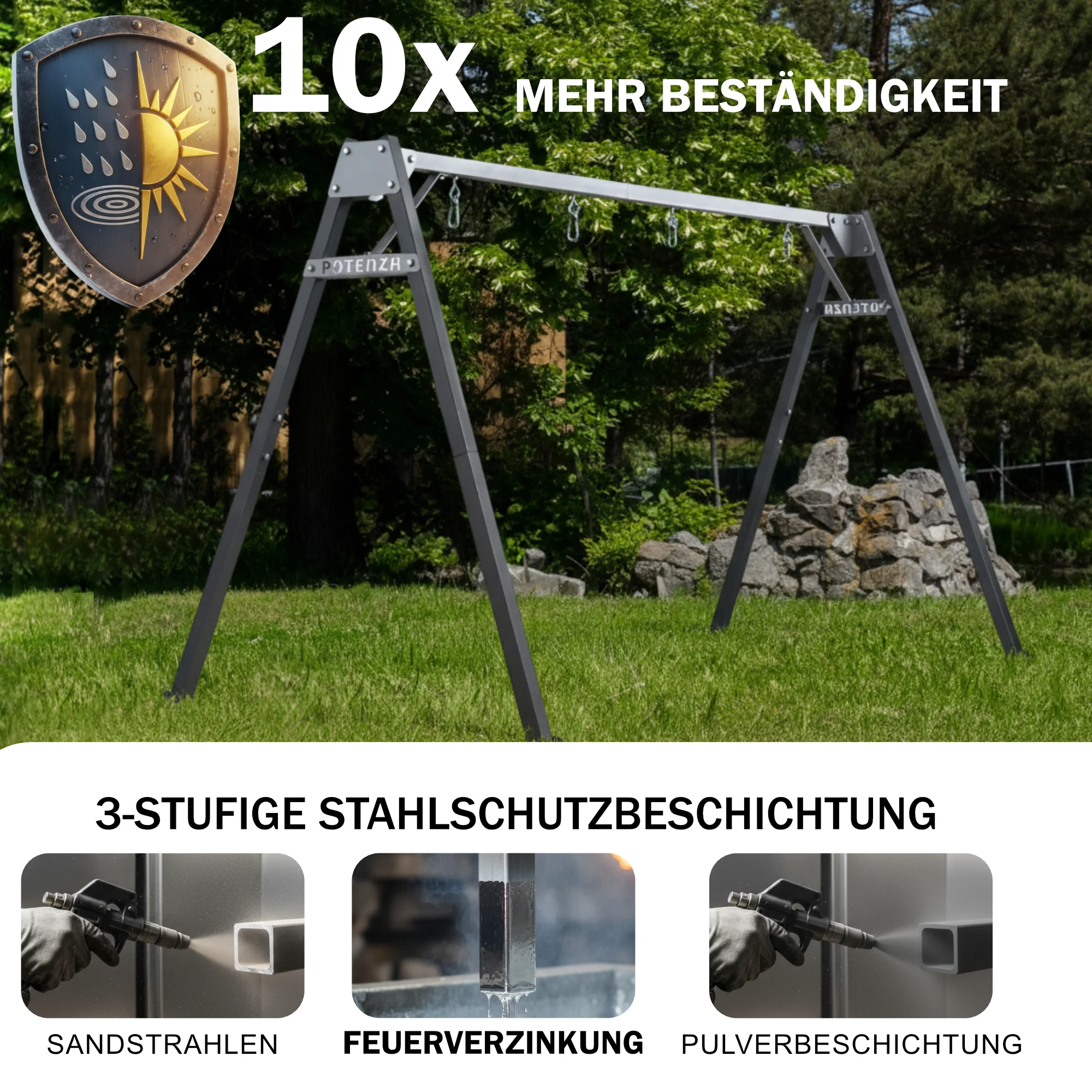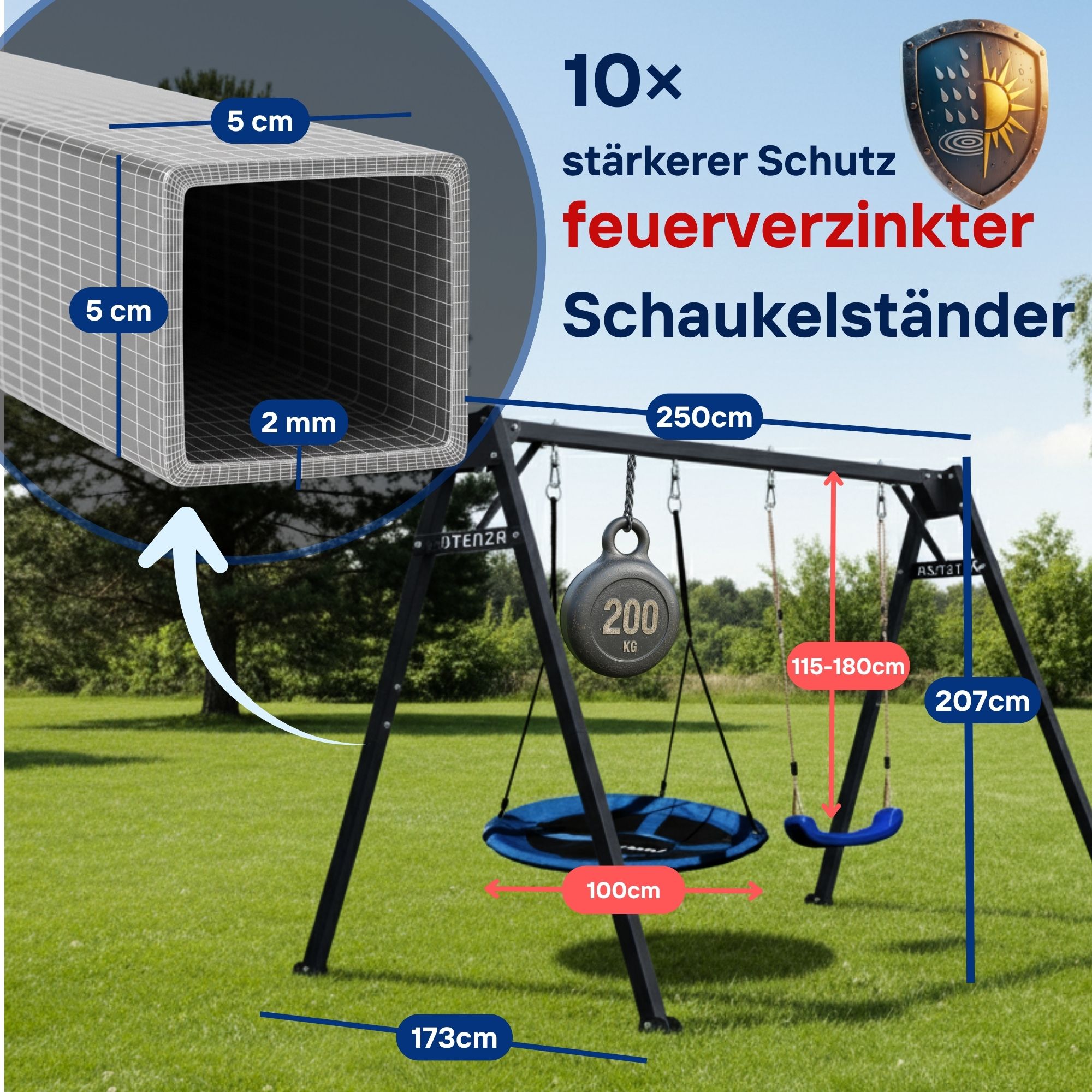 Stabiler Schaukelrahmen – wir sparen nicht am Stahl. Gefertigt aus robustem Stahlprofil mit 2 mm Wandstärke bietet der Rahmen hohe Belastbarkeit und dauerhafte Formstabilität – auch bei intensiver Nutzung. Mit einem Gewicht von 45 kg steht das Gestell für solide und zuverlässige Verarbeitung.