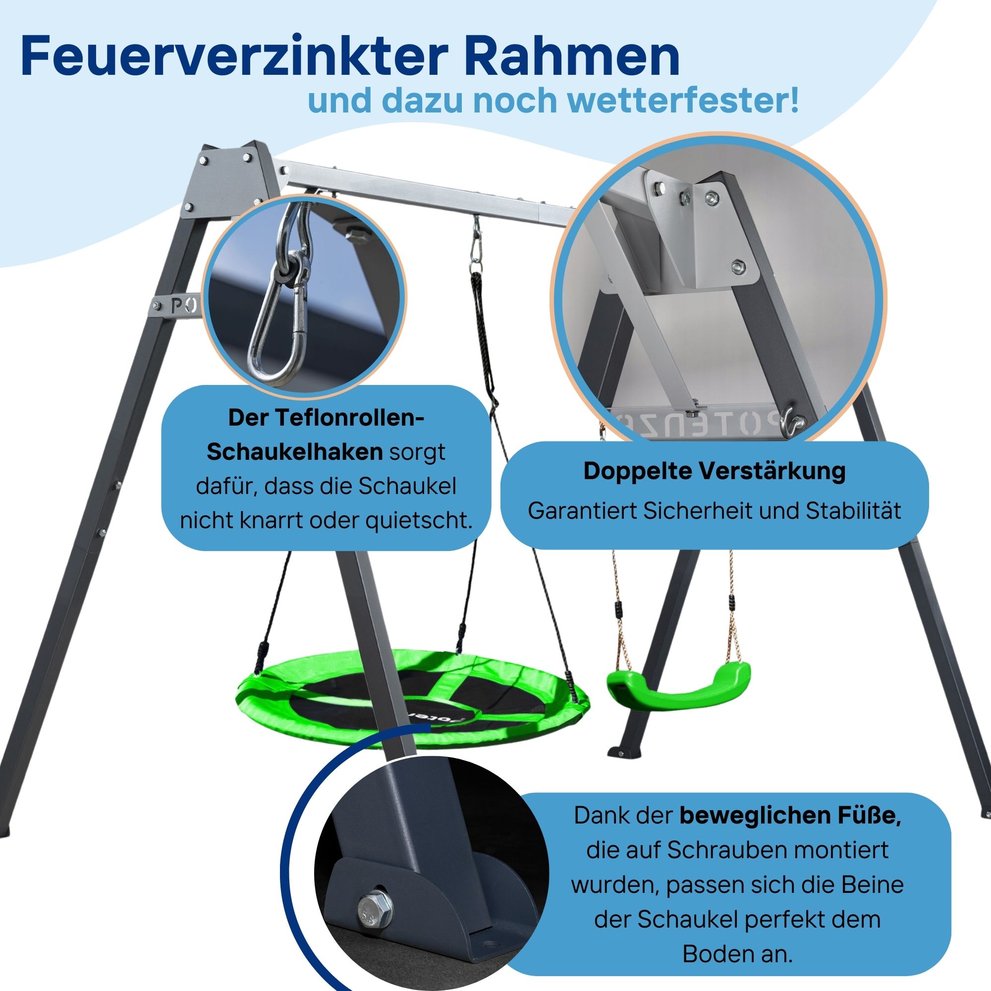 • Teflon-Schaukelhaken verhindern Knarren und Quietschen und sorgen für besonders leises Schaukeln.