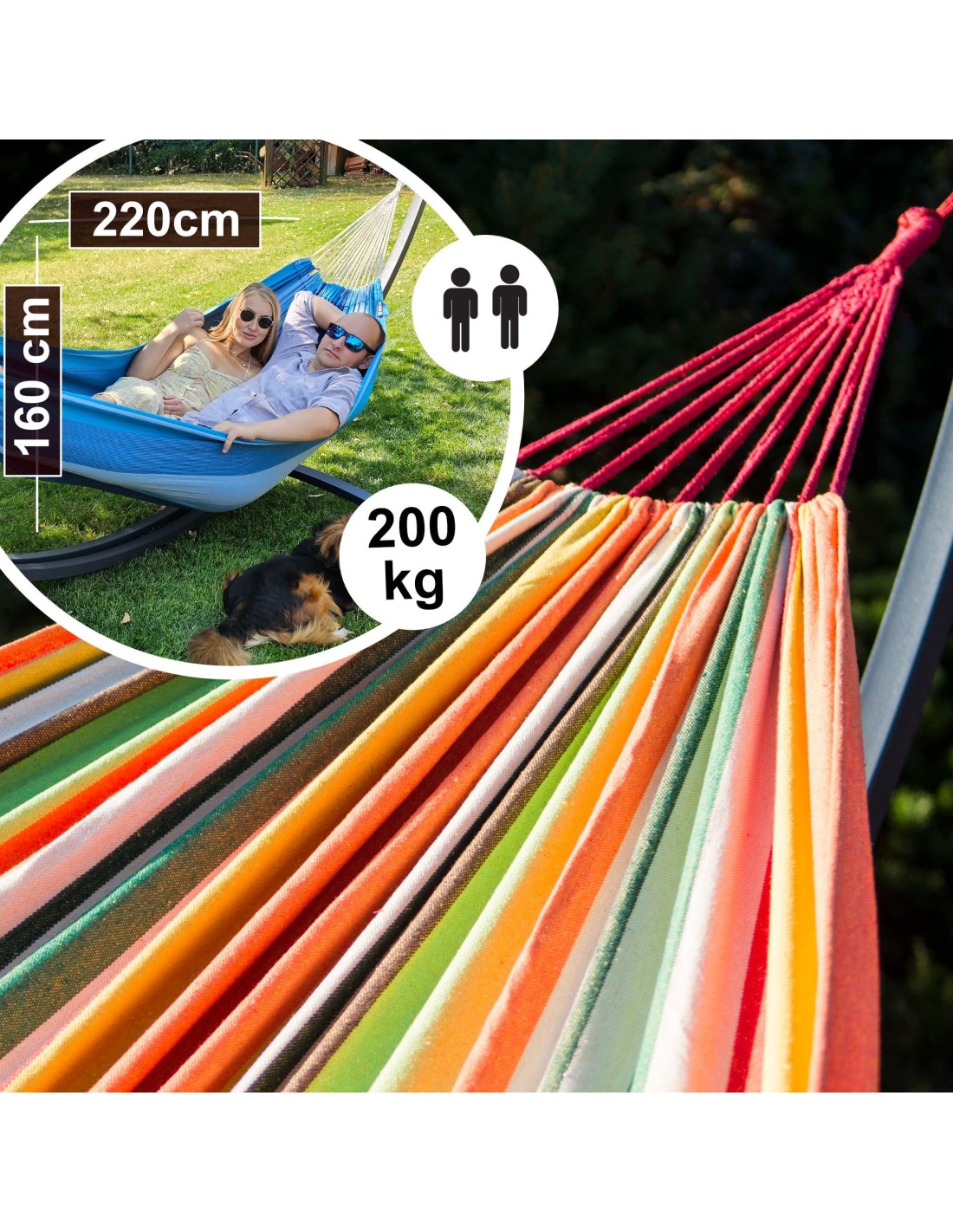 Große Gartenhängematte mit einer extra großen Liegefläche von 220×160cm und einer Belastbarkeit von bis zu 200 kg. Sie bietet bequem Platz für zwei Personen.