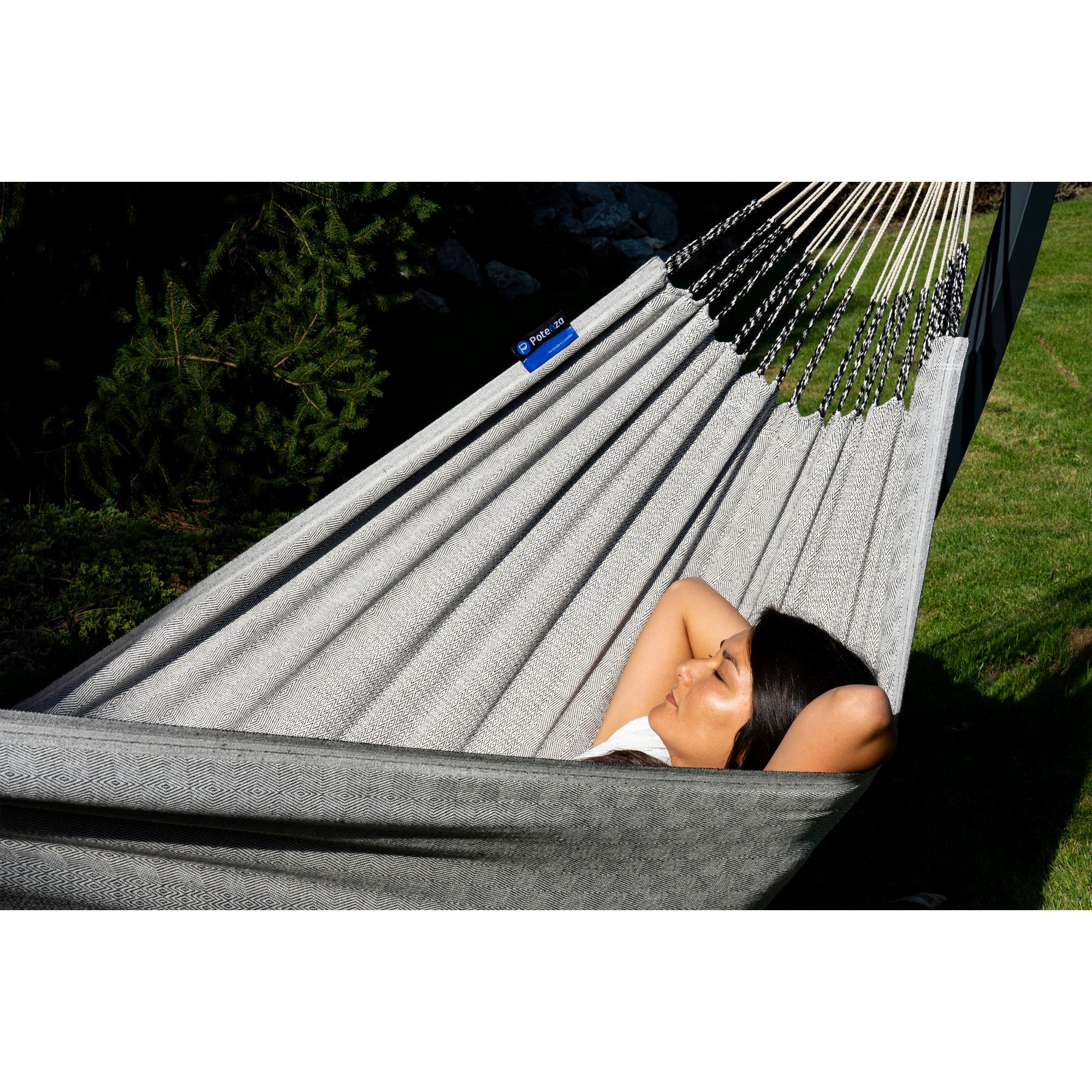 Die weit gespannten Gestellarme sorgen dafür, dass die gesamte Liegefläche optimal genutzt werden kann. Durch die Spannung der Aufhängung kannst du selbst beeinflussen, wie viel Platz dir zur Verfügung steht – je nach Einstellung entsteht mehr Raum für eine Person oder für gemütliches Liegen zu zweit.