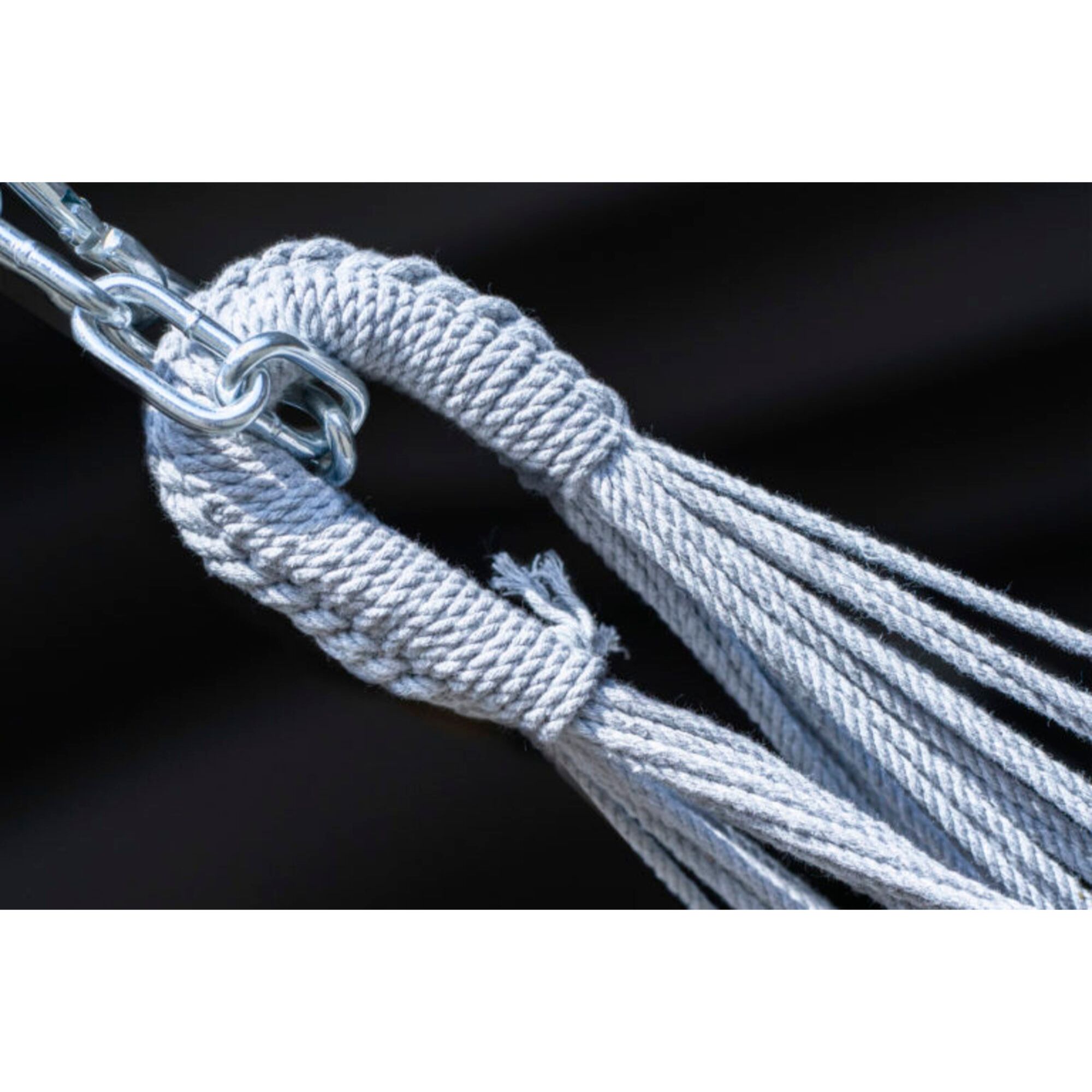Zur Befestigung am Gestell ist im Lieferumfang ein Set aus Kette und Karabinerhaken enthalten. Dank ihnen lässt sich die Spannung des Hängemattenstoffes individuell regulieren.