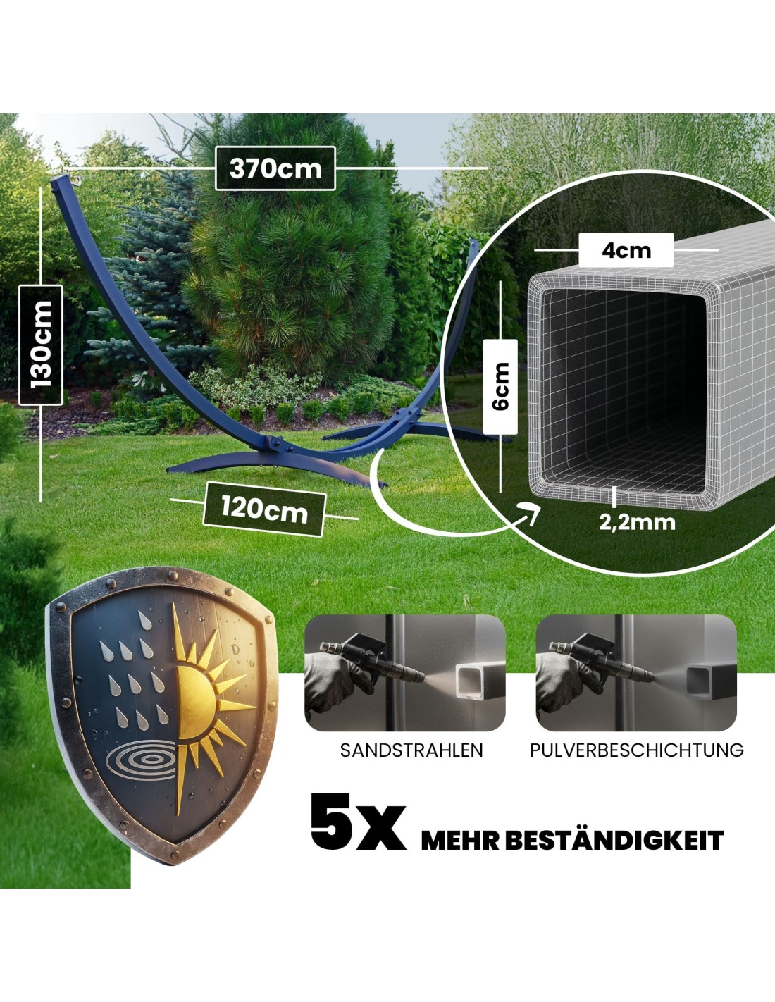 Ein robustes Stahlgestell sorgt für sicheren Halt und angenehme Entspannung – auch für bis zu zwei Personen.