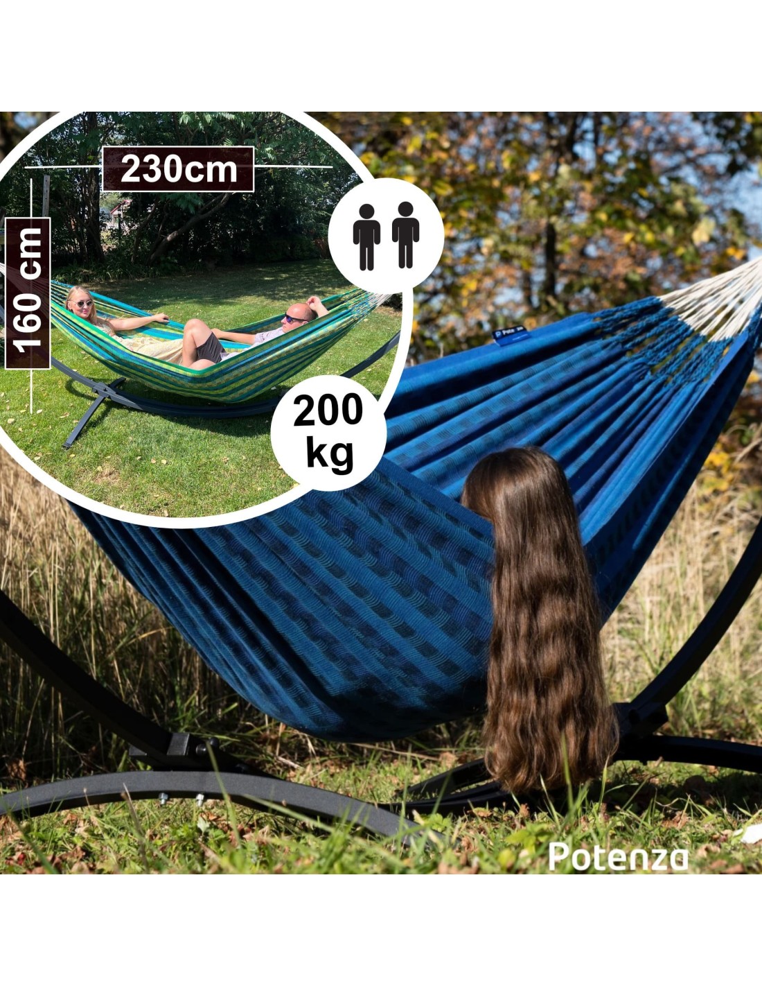 Große Gartenhängematte mit einer extra großen Liegefläche von 230×160cm und einer Belastbarkeit von bis zu 200 kg. Sie bietet bequem Platz für zwei Personen.