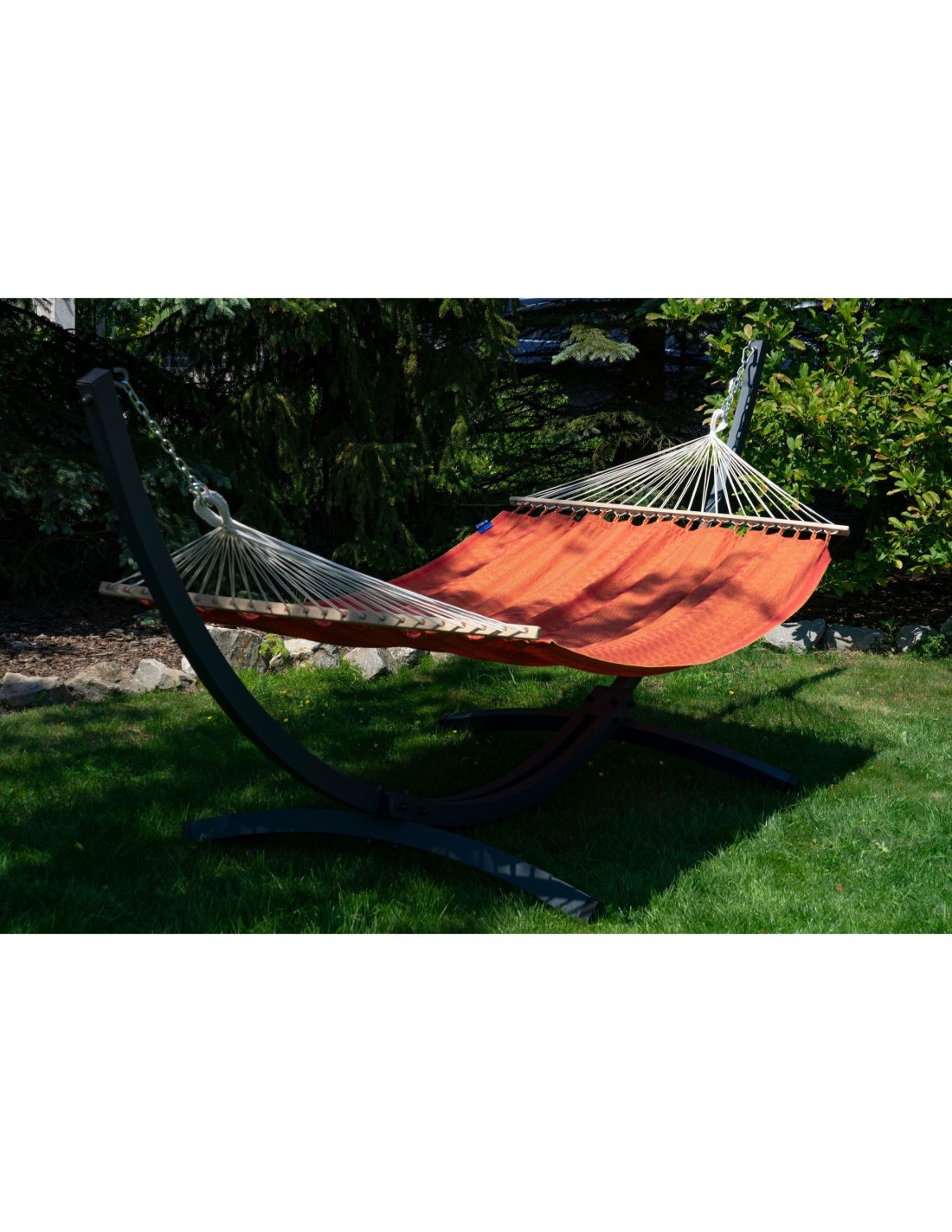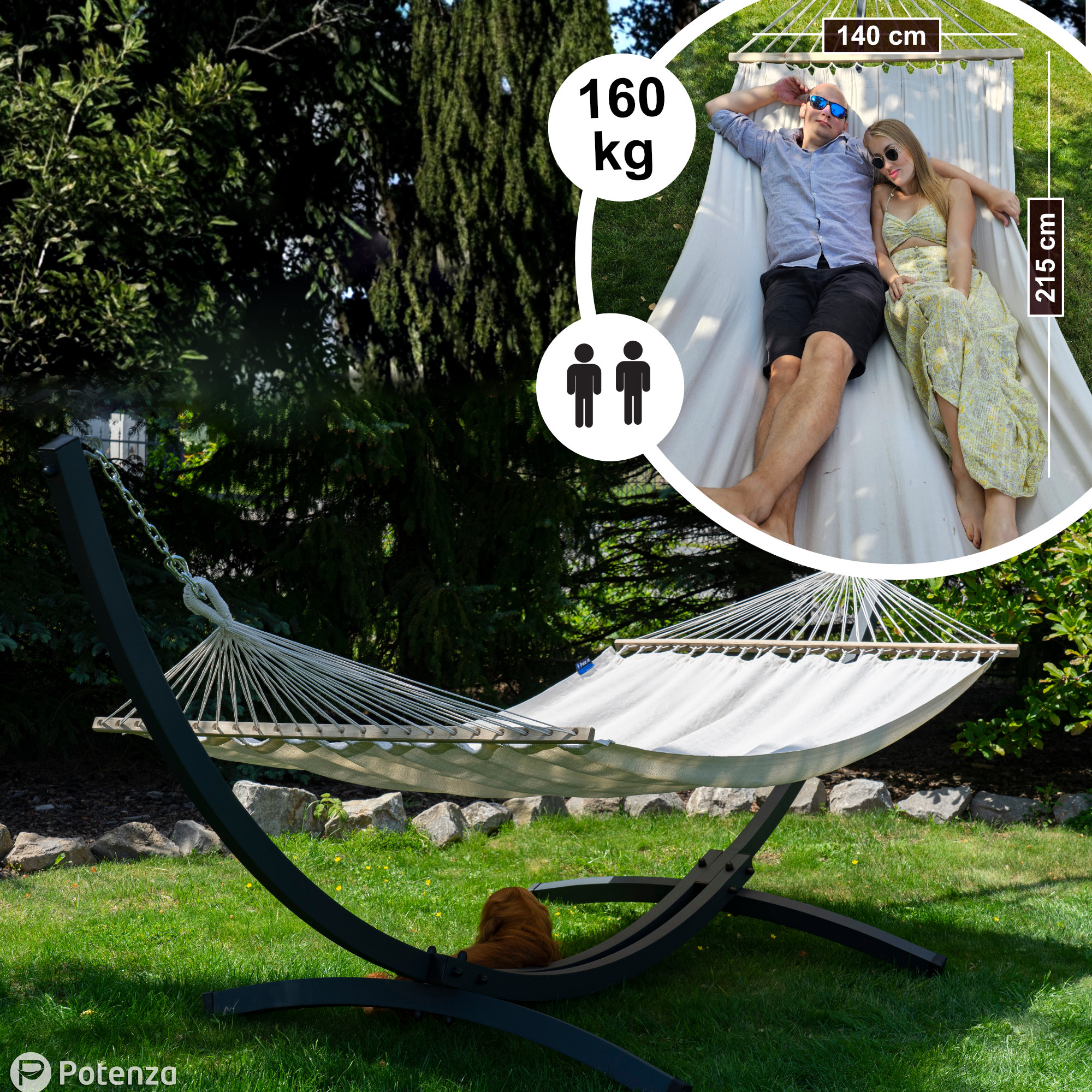 Die weit gespannten Gestellarme sorgen dafür, dass die gesamte Liegefläche optimal genutzt werden kann. Durch die Spannung der Aufhängung kannst du selbst beeinflussen, wie viel Platz dir zur Verfügung steht – je großzügiger gespannt, desto mehr Raum für zwei Personen.