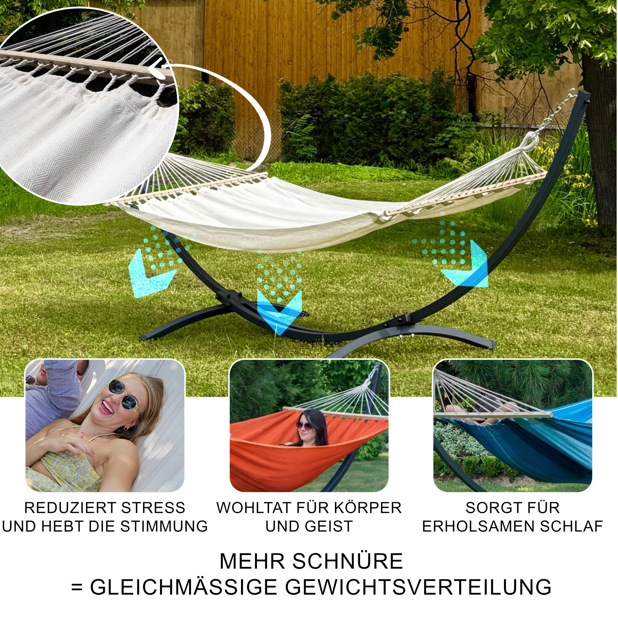 Dank der vielen  Aufhängeschnüre wird dein  Gewicht gleichmäßig über die gesamte Liegefläche verteilt.