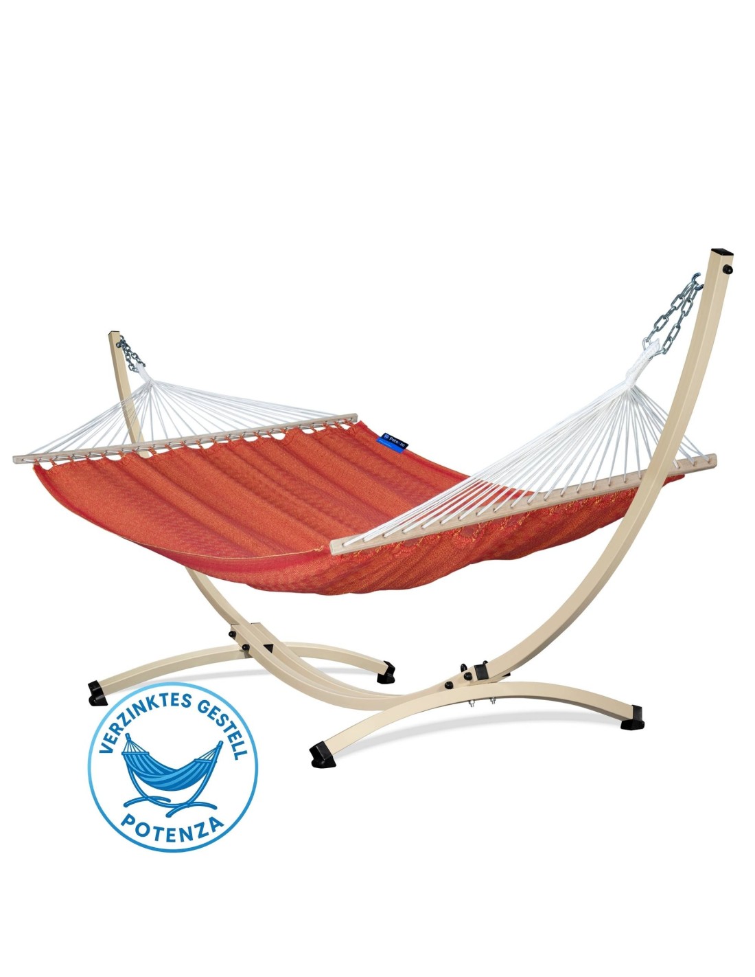 Die weit gespannten Gestellarme sorgen dafür, dass die gesamte Liegefläche optimal genutzt werden kann. Durch die Spannung der Aufhängung kannst du selbst beeinflussen, wie viel Platz dir zur Verfügung steht – je großzügiger gespannt, desto mehr Raum für zwei Personen.