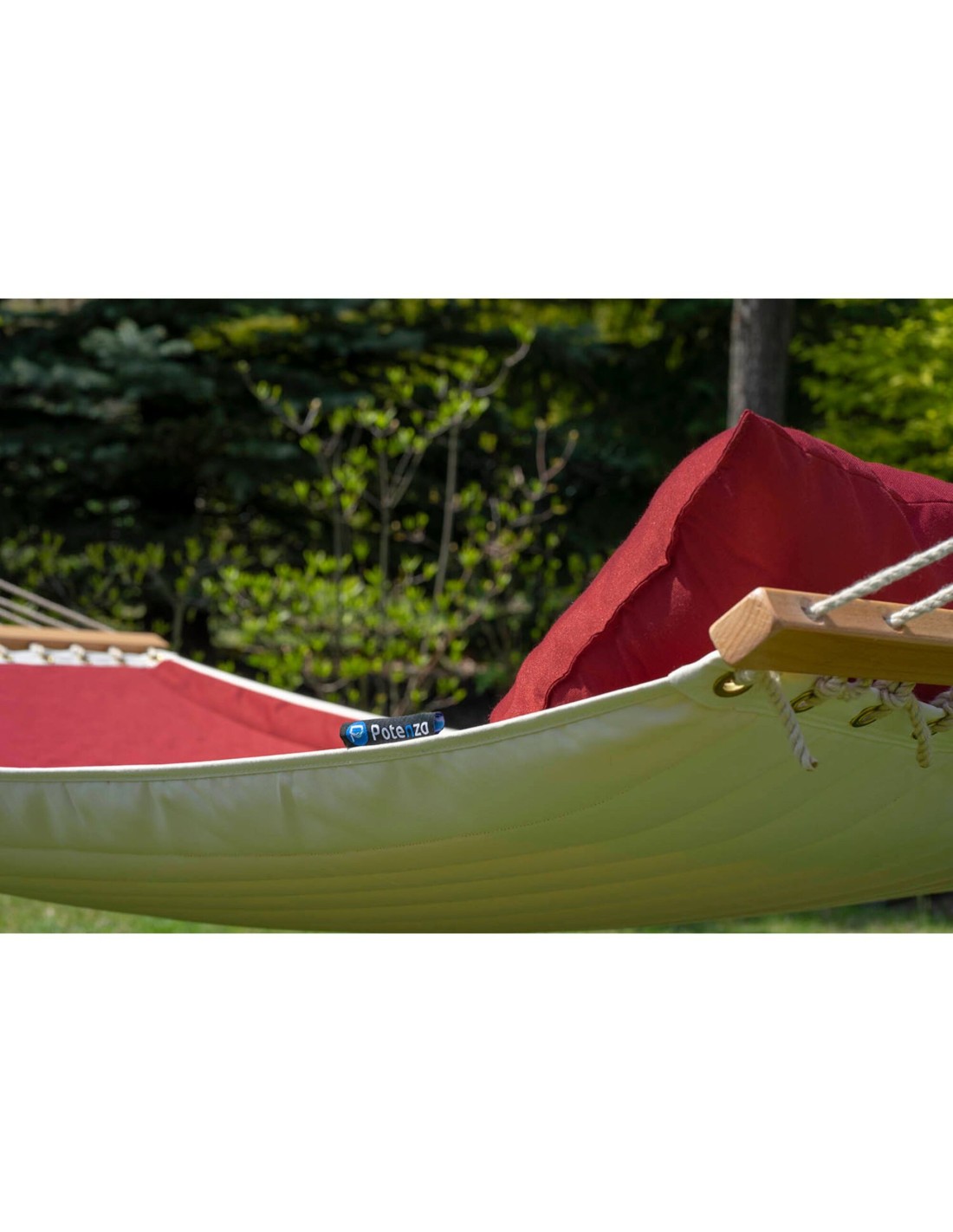 Dank der quer verlaufenden Holzstange rollt sich das Material der Hängematte nicht nach innen und bleibt immer „offen”.