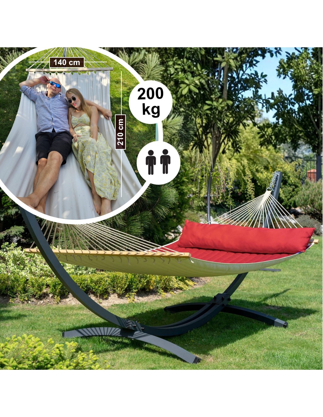 Große Gartenhängematte mit einer extra großen Liegefläche von 210×140cm und einer Belastbarkeit von bis zu 200 kg. Sie bietet bequem Platz für zwei Personen.