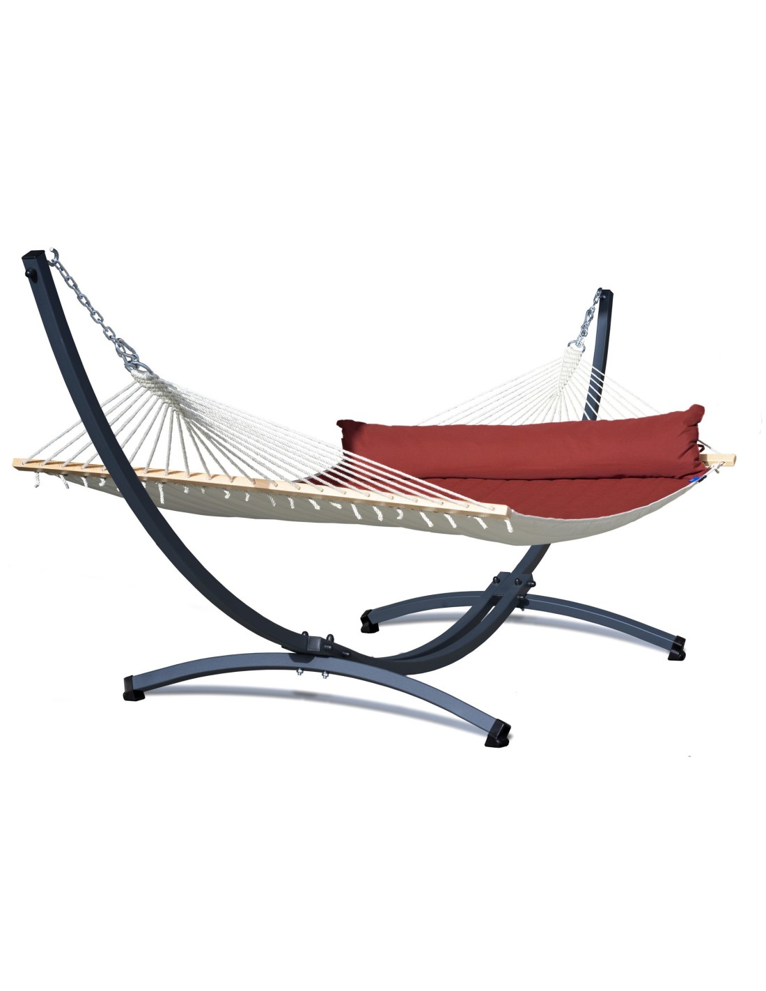 Die weit gespannten Gestellarme sorgen dafür, dass die gesamte Liegefläche optimal genutzt werden kann. Durch die Spannung der Aufhängung kannst du selbst beeinflussen, wie viel Platz dir zur Verfügung steht – je großzügiger gespannt, desto mehr Raum für zwei Personen.
