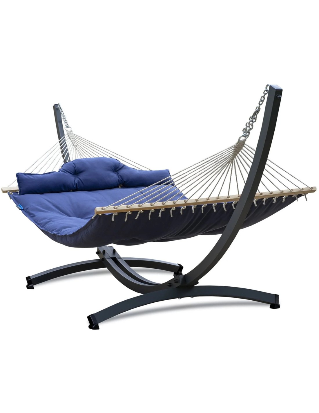 Die Doppelhängematte hat zwei Querstreben aus dickem Holz, die den Stoff straffen und verhindern, dass er sich nach innen rollt. So können Sie sich darauf sonnen, ein Buch lesen und an der frischen Luft entspannen. Die Hängematte mit Stäben ist an verstellbaren Ketten befestigt, mit denen man die Hängematte zur Aufbewahrung leicht abnehmen kann.