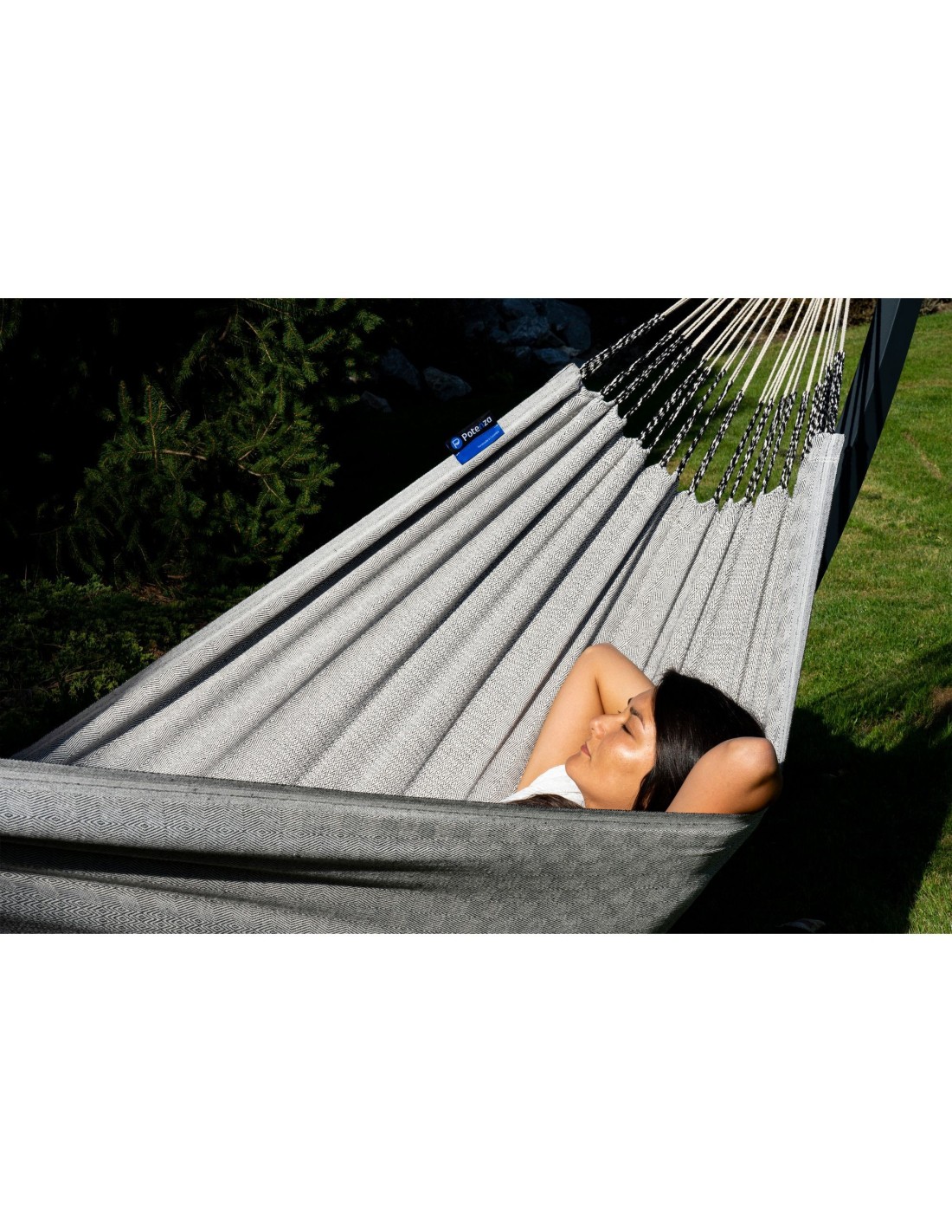 Der Stoff ist besonders angenehm und weich, fast wie eine kuschelige Decke. Die feine Fischgrätstruktur (Herringbone-Muster) verleiht der Hängematte zusätzlich eine elegante und hochwertige Optik.