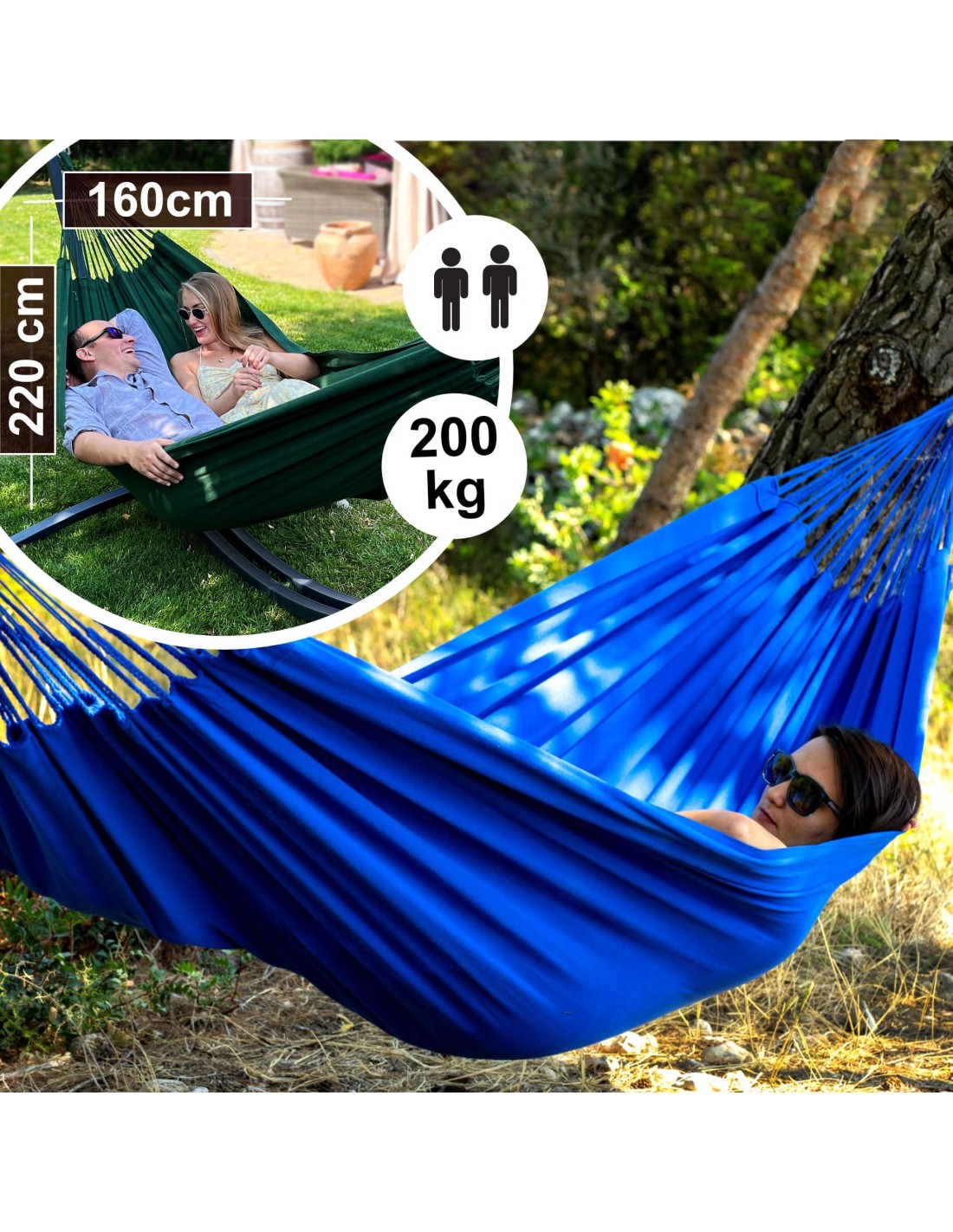Große Gartenhängematte mit einer extra großen Liegefläche von 220×160cm und einer Belastbarkeit von bis zu 200 kg. Sie bietet bequem Platz für zwei Personen.