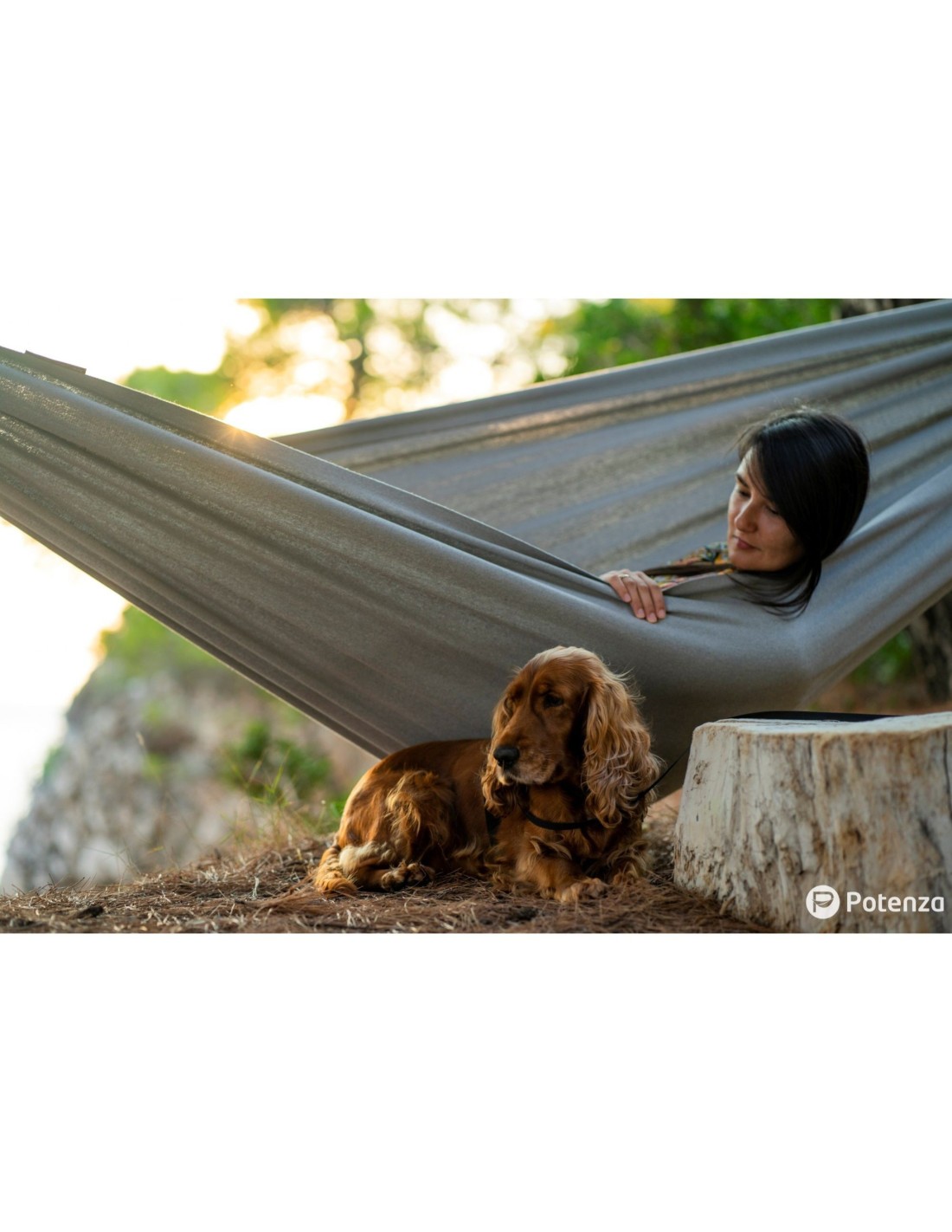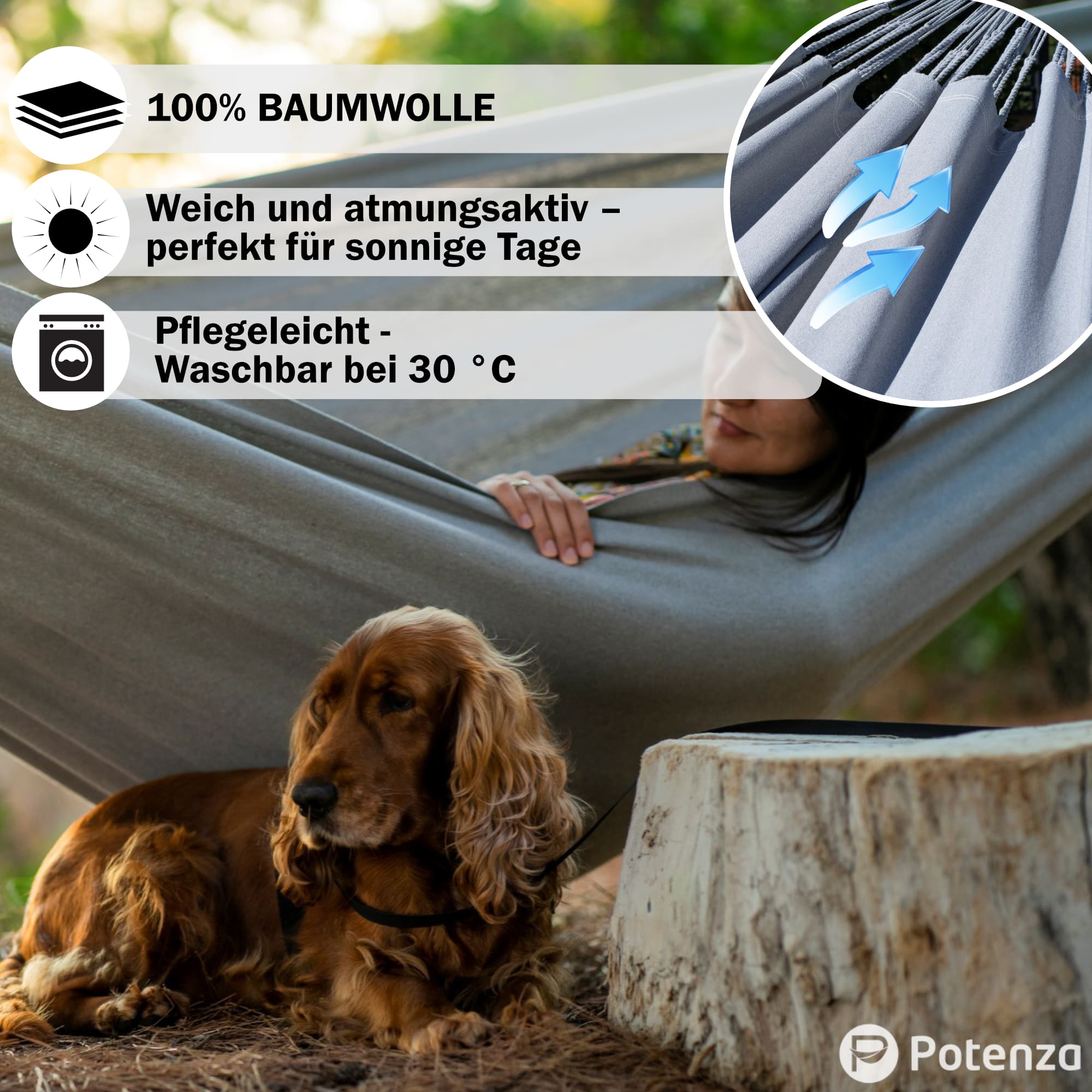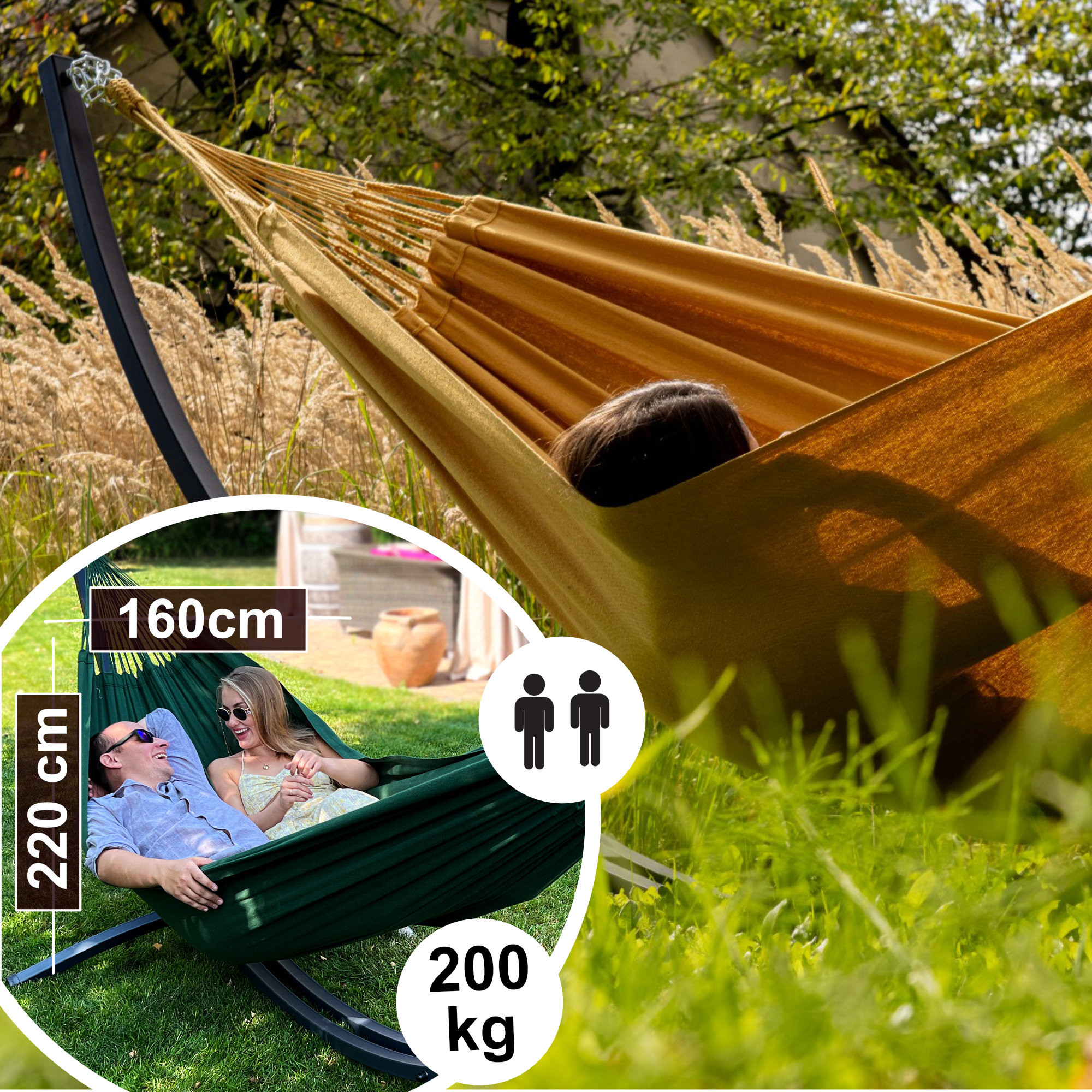 Große Gartenhängematte mit einer extra großen Liegefläche von 220×160cm und einer Belastbarkeit von bis zu 200 kg. Sie bietet bequem Platz für zwei Personen.