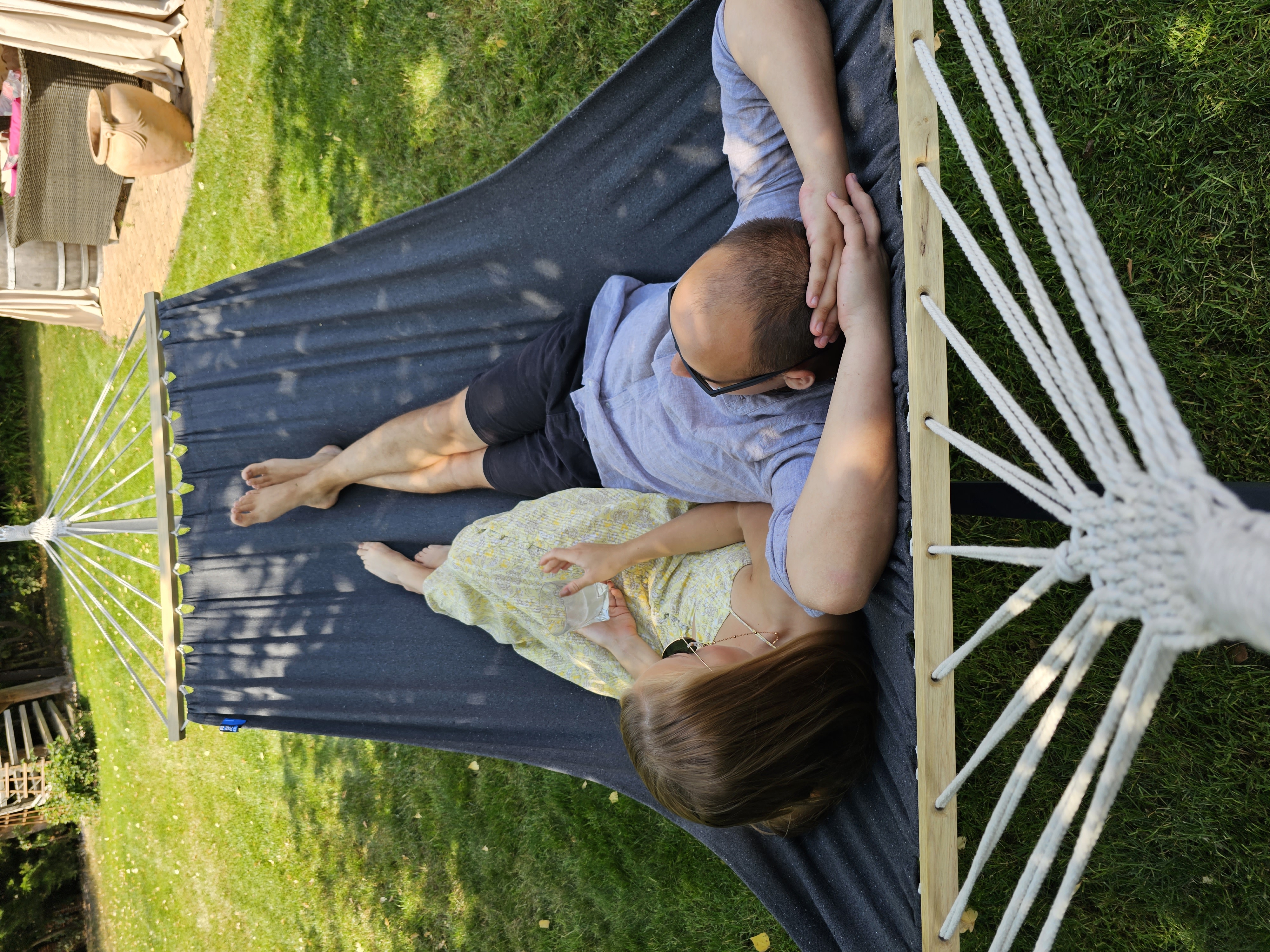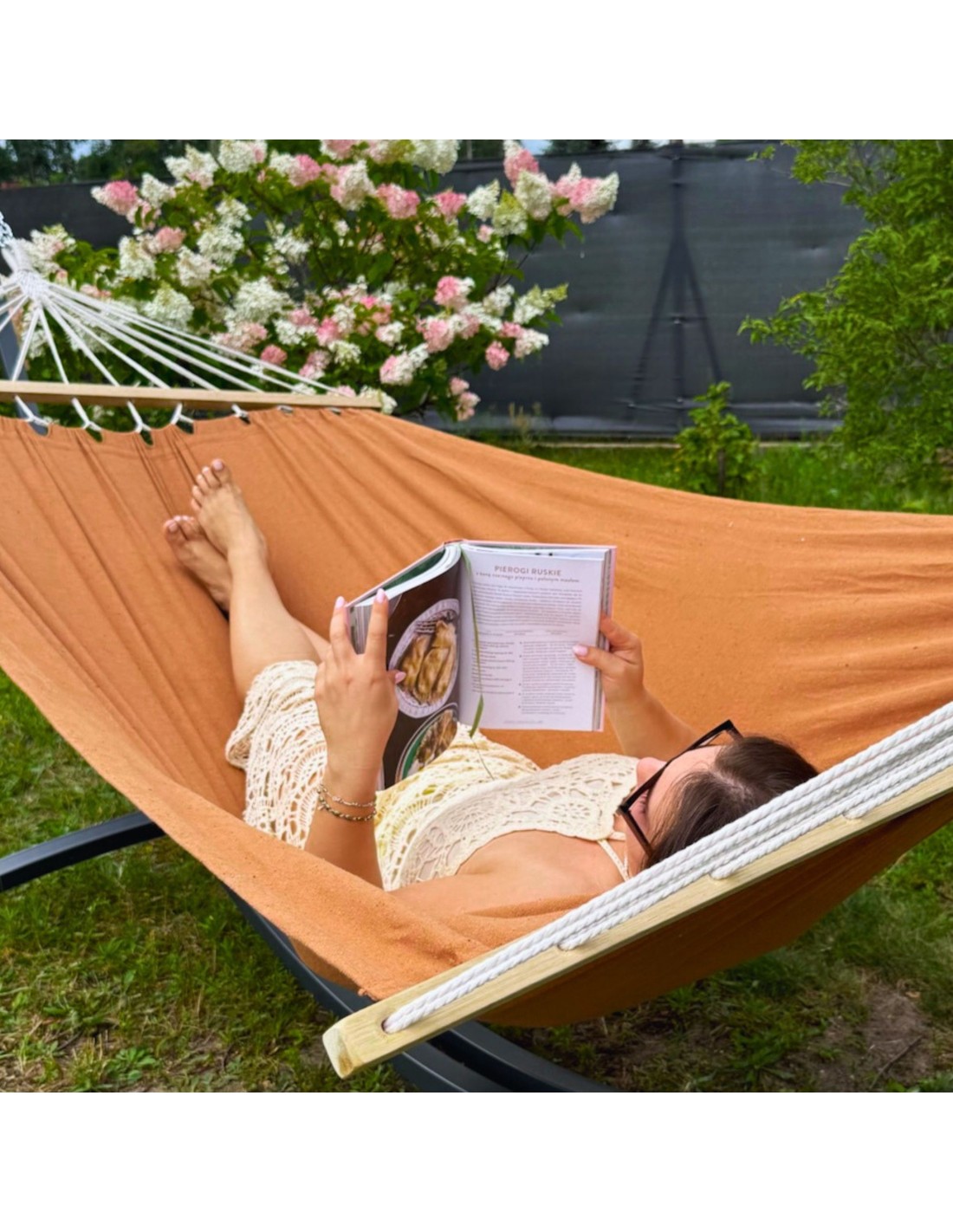 Große Gartenhängematte mit einer extra großen Liegefläche von 220×160cm und einer Belastbarkeit von bis zu 200 kg. Sie bietet bequem Platz für zwei Personen.