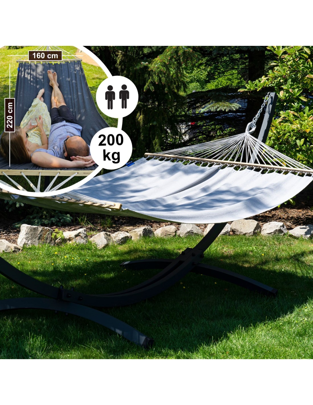 Große Gartenhängematte mit einer extra großen Liegefläche von 215×160cm und einer Belastbarkeit von bis zu 200 kg. Sie bietet bequem Platz für zwei Personen.
