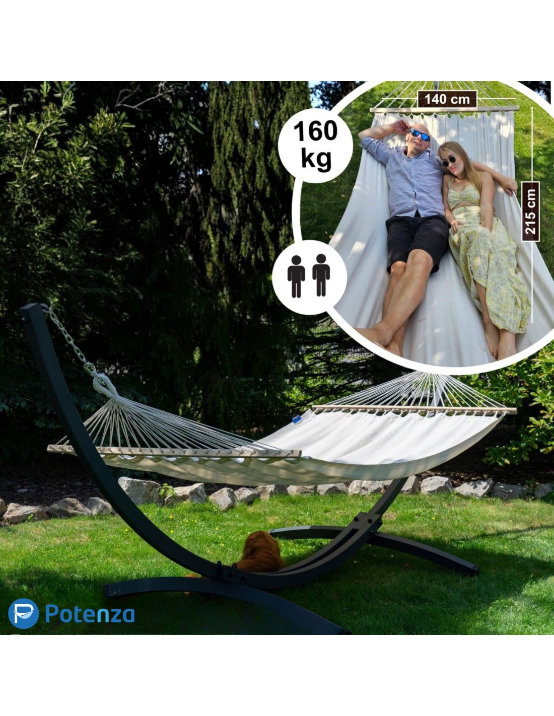 Große Gartenhängematte mit einer extra großen Liegefläche von 215×140cm und einer Belastbarkeit von bis zu 160 kg. Sie bietet bequem Platz für zwei Personen.