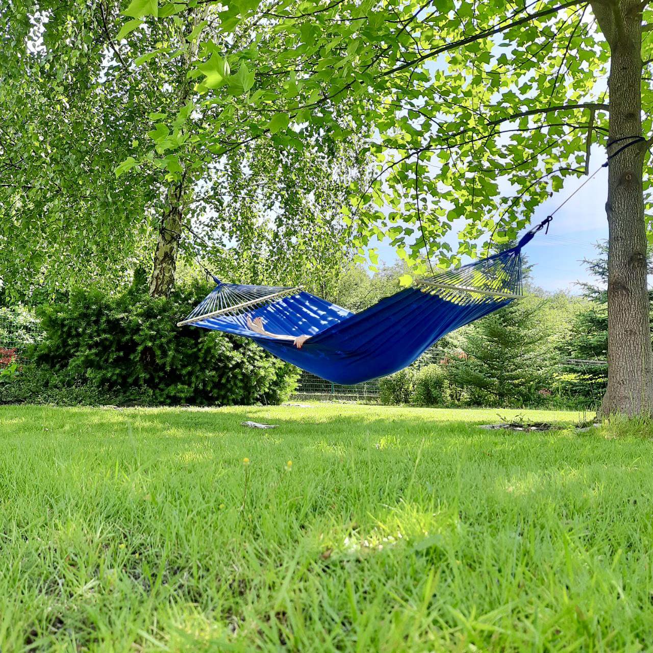 Du kannst die Hängematte an einem Baum, auf dem Balkon oder zwischen einem Baum und einer Stange aufhängen. Oder wenn du keinen Platz hast, kannst du ein Set mit Ständer kaufen.