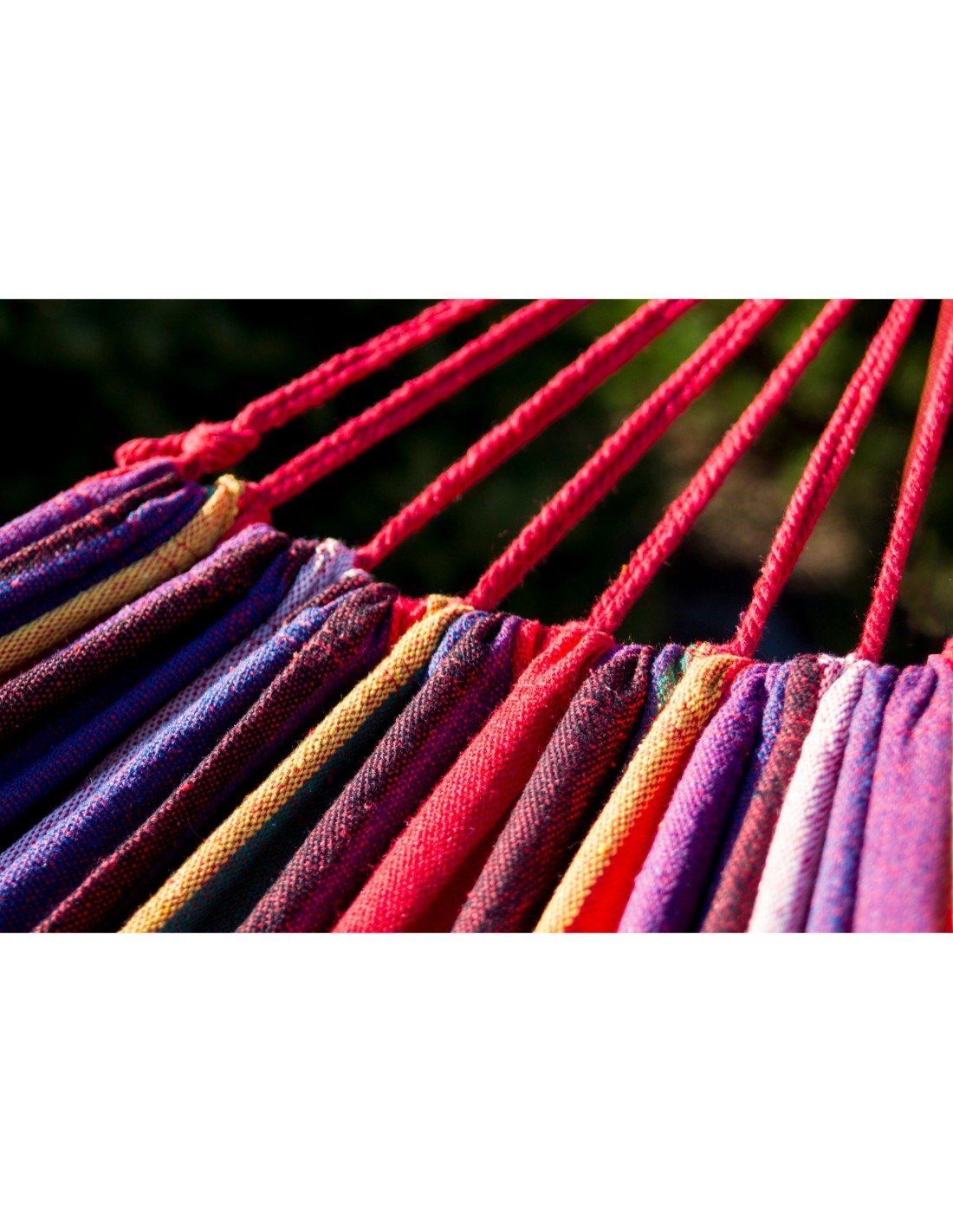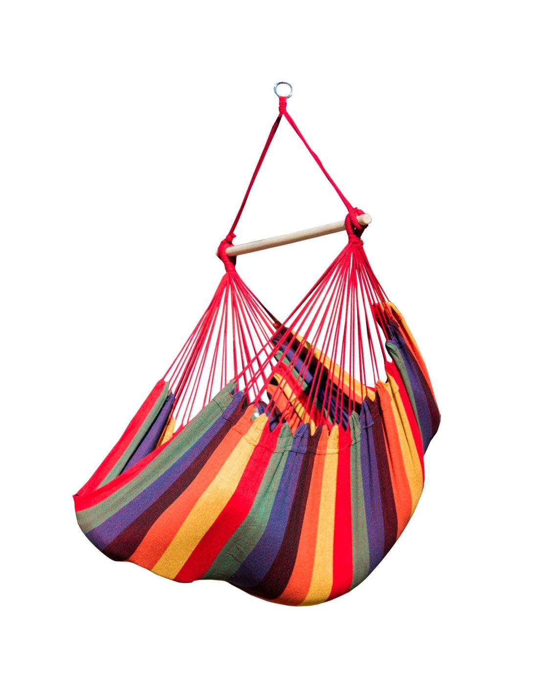 Bequeme Hängesessel aus Baumwolle. Es bietet eine bequeme Erholung. Darüber hinaus verleihen schöne Farben Ihrem Garten oder Balkon Charme.