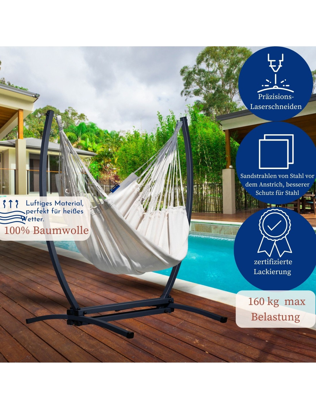 L – 160 × 115 cm, 110 cm langer Holzstab, maximale Belastbarkeit: 120 kg