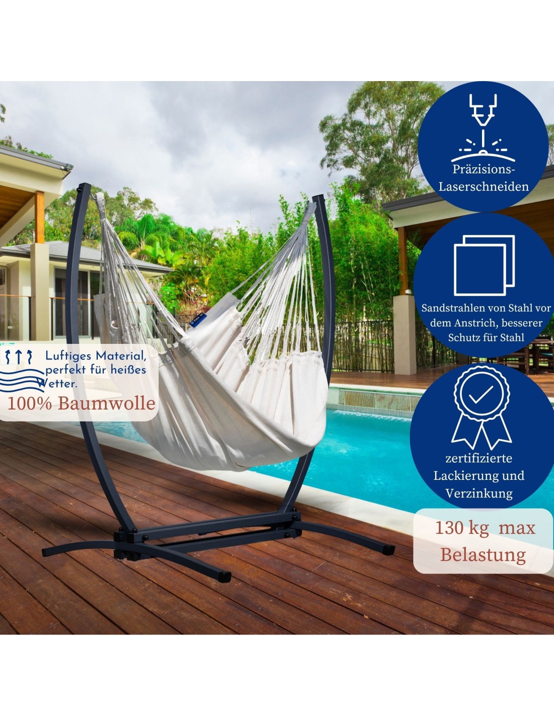 Ein robustes Gazela Stahlgestell sorgt für sicheren Halt und angenehme Entspannung im Hängestuhl.