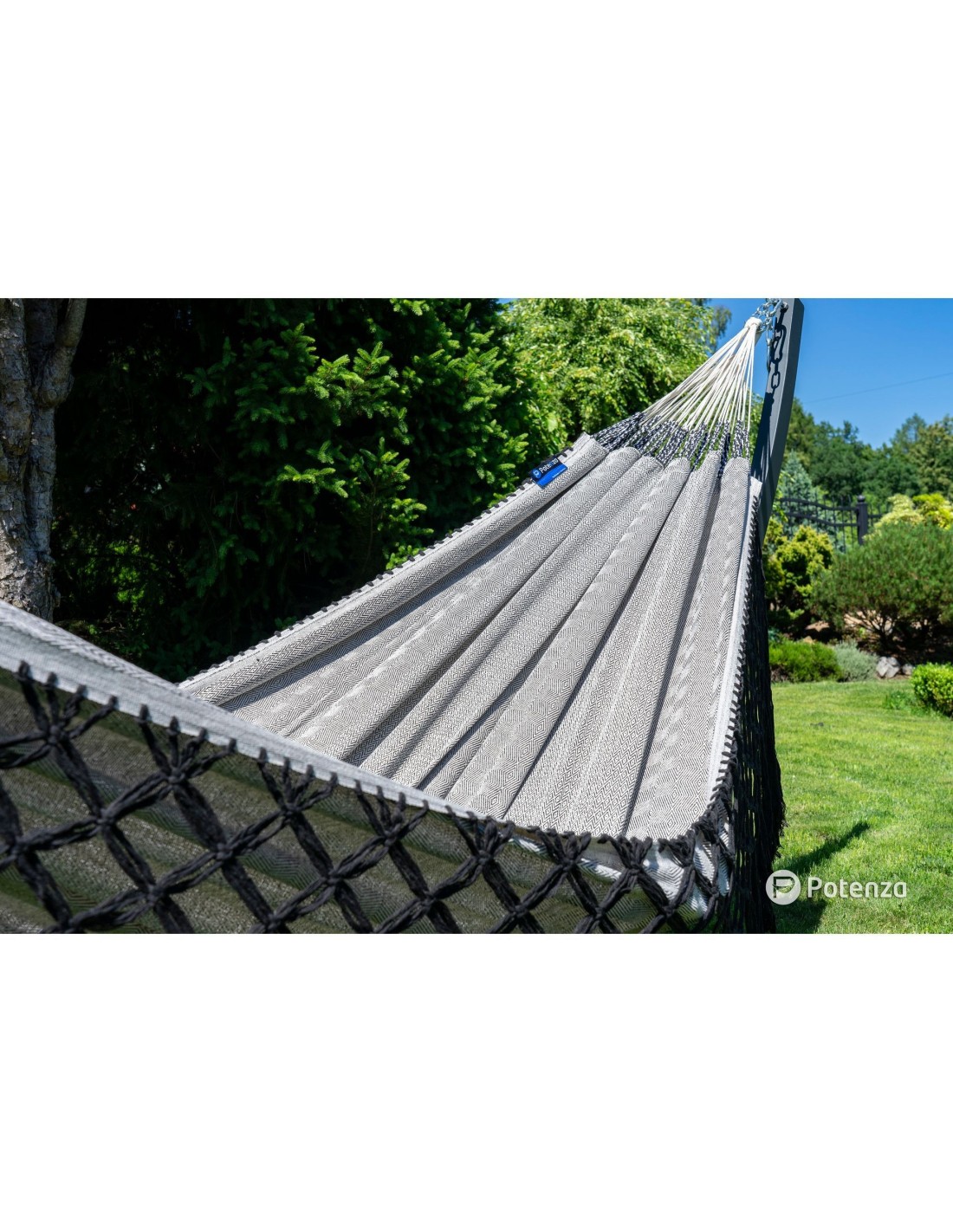 Große Gartenhängematte mit einer extra großen Liegefläche von 230×160cm und einer Belastbarkeit von bis zu 200 kg. Sie bietet bequem Platz für zwei Personen.