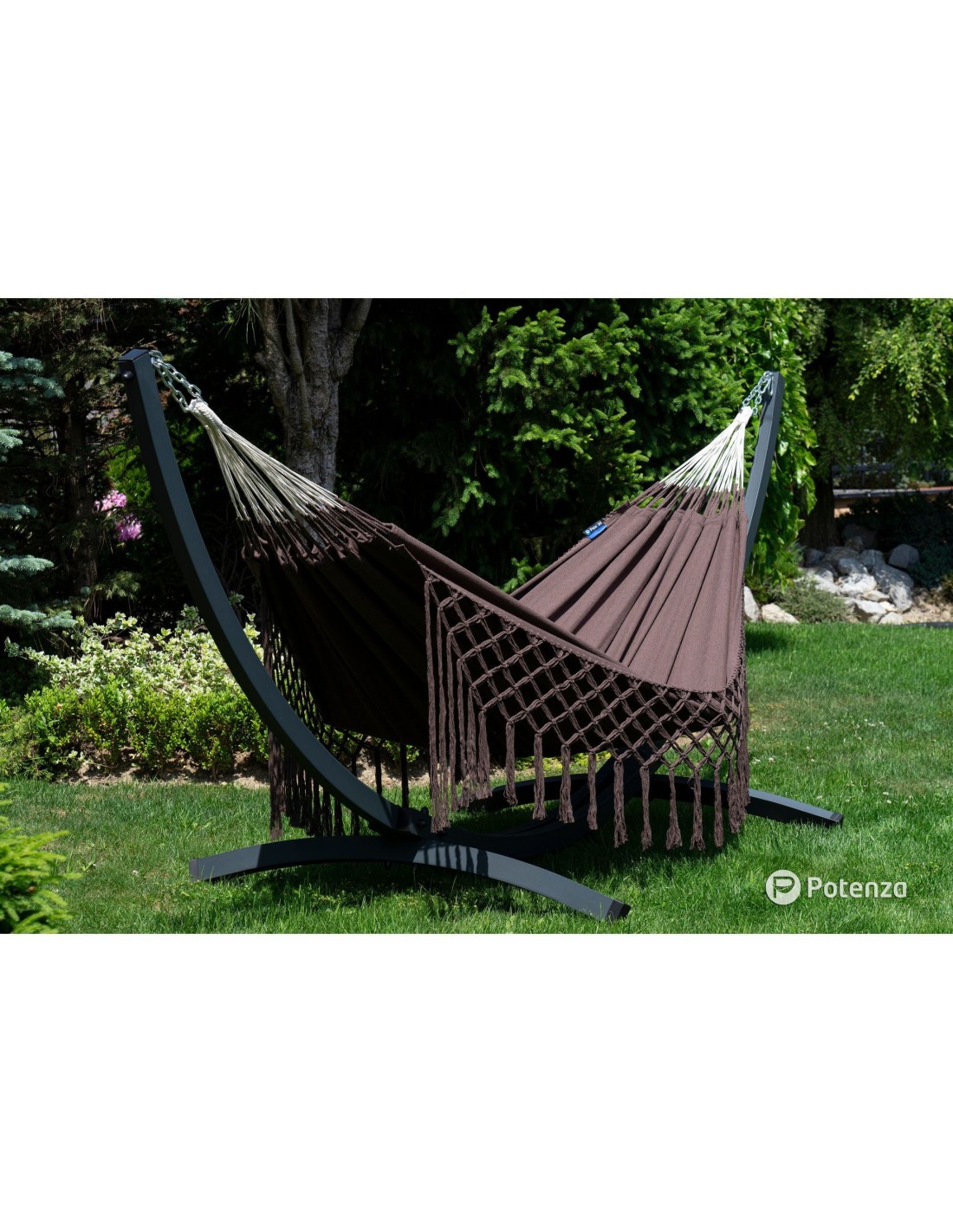 Große Gartenhängematte mit einer extra großen Liegefläche von 230×160cm und einer Belastbarkeit von bis zu 200 kg. Sie bietet bequem Platz für zwei Personen.