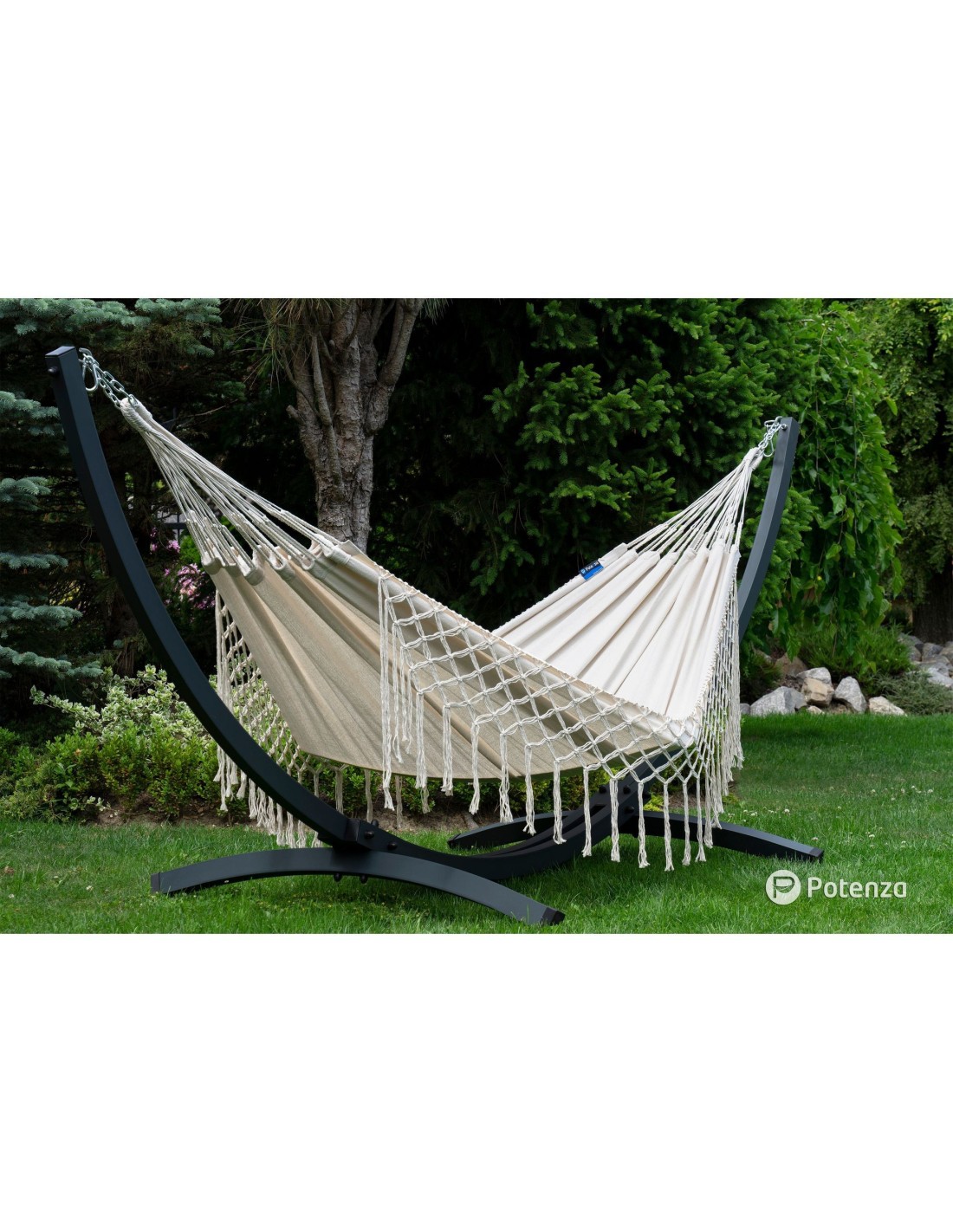 Die weit gespannten Gestellarme sorgen dafür, dass die gesamte Liegefläche optimal genutzt werden kann. Durch die Spannung der Aufhängung kannst du selbst beeinflussen, wie viel Platz dir zur Verfügung steht – je großzügiger gespannt, desto mehr Raum für zwei Personen.
