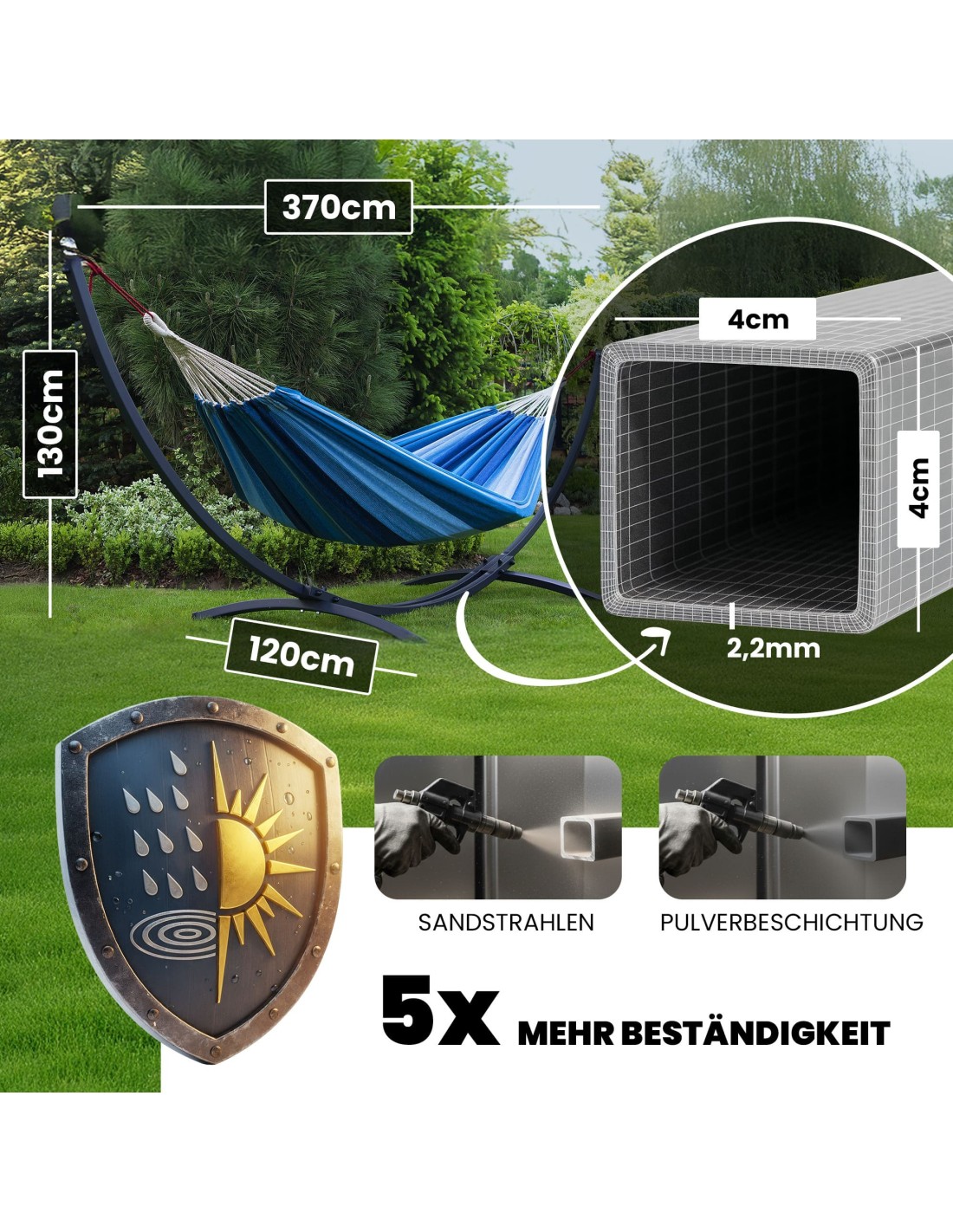 Ein robustes Stahlgestell sorgt für sicheren Halt und angenehme Entspannung – auch für bis zu zwei Personen.