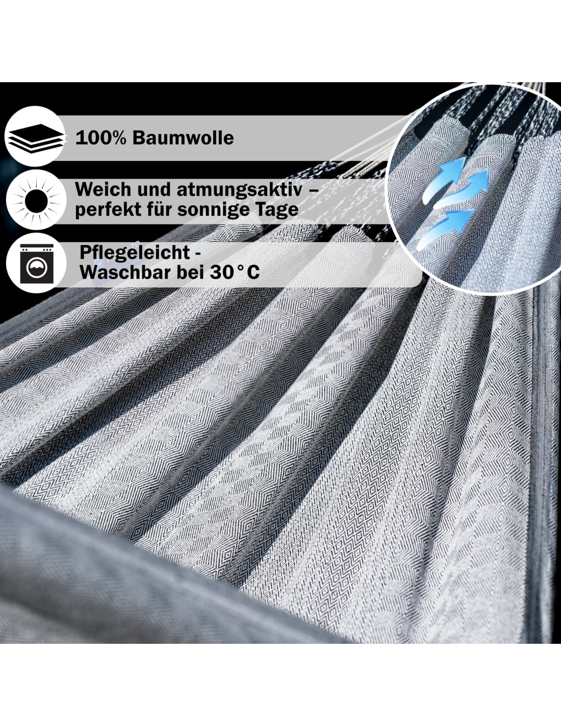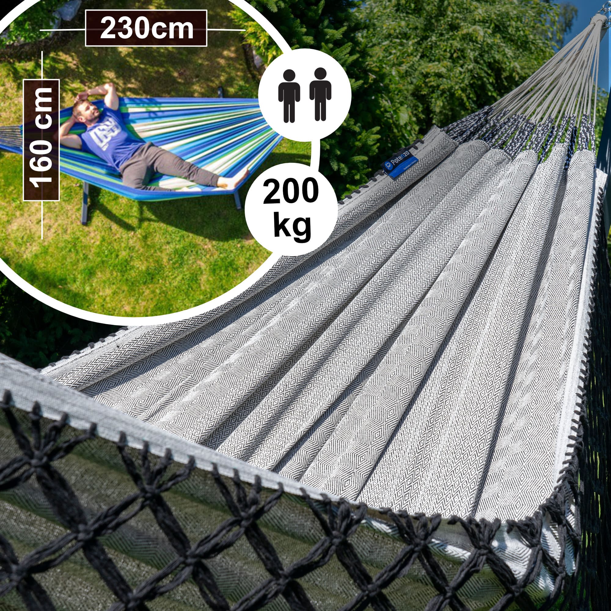 Große Gartenhängematte mit einer extra großen Liegefläche von 230×160cm und einer Belastbarkeit von bis zu 200 kg. Sie bietet bequem Platz für zwei Personen.