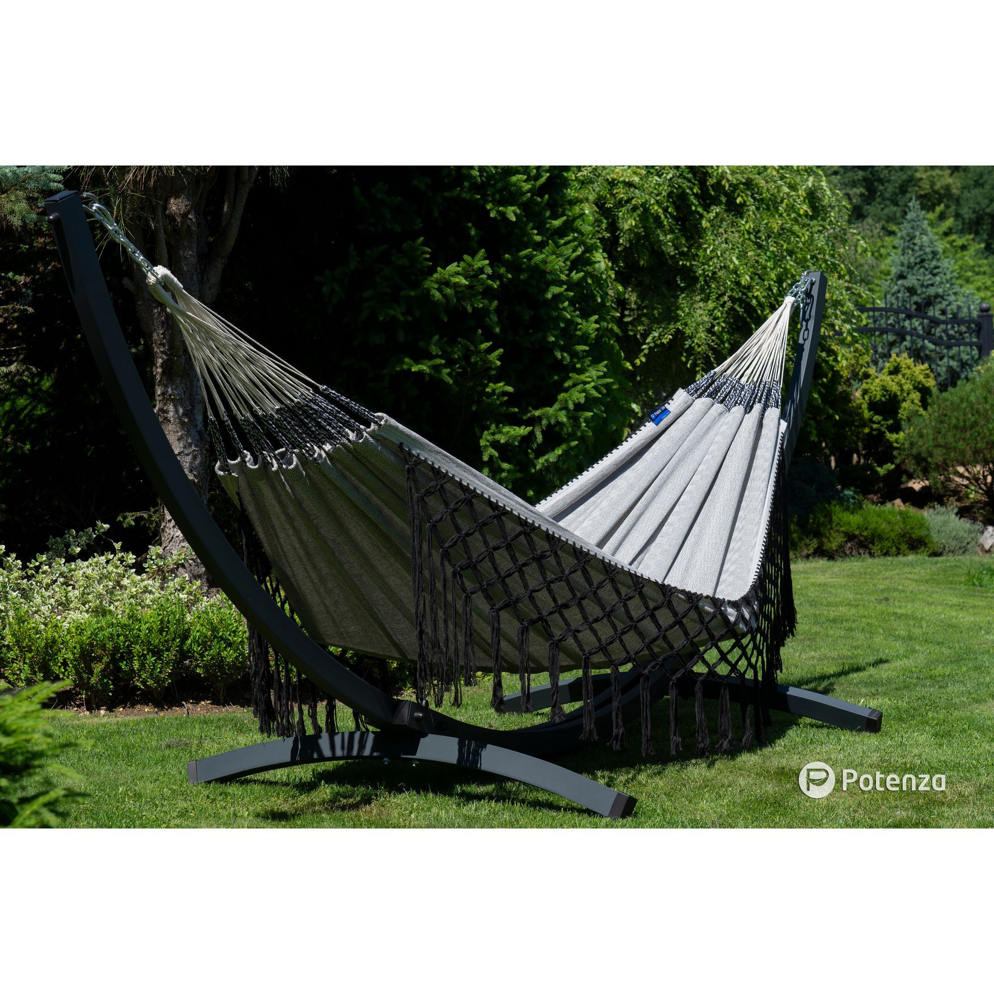 Die weit gespannten Gestellarme sorgen dafür, dass die gesamte Liegefläche optimal genutzt werden kann. Durch die Spannung der Aufhängung kannst du selbst beeinflussen, wie viel Platz dir zur Verfügung steht – je großzügiger gespannt, desto mehr Raum für zwei Personen.