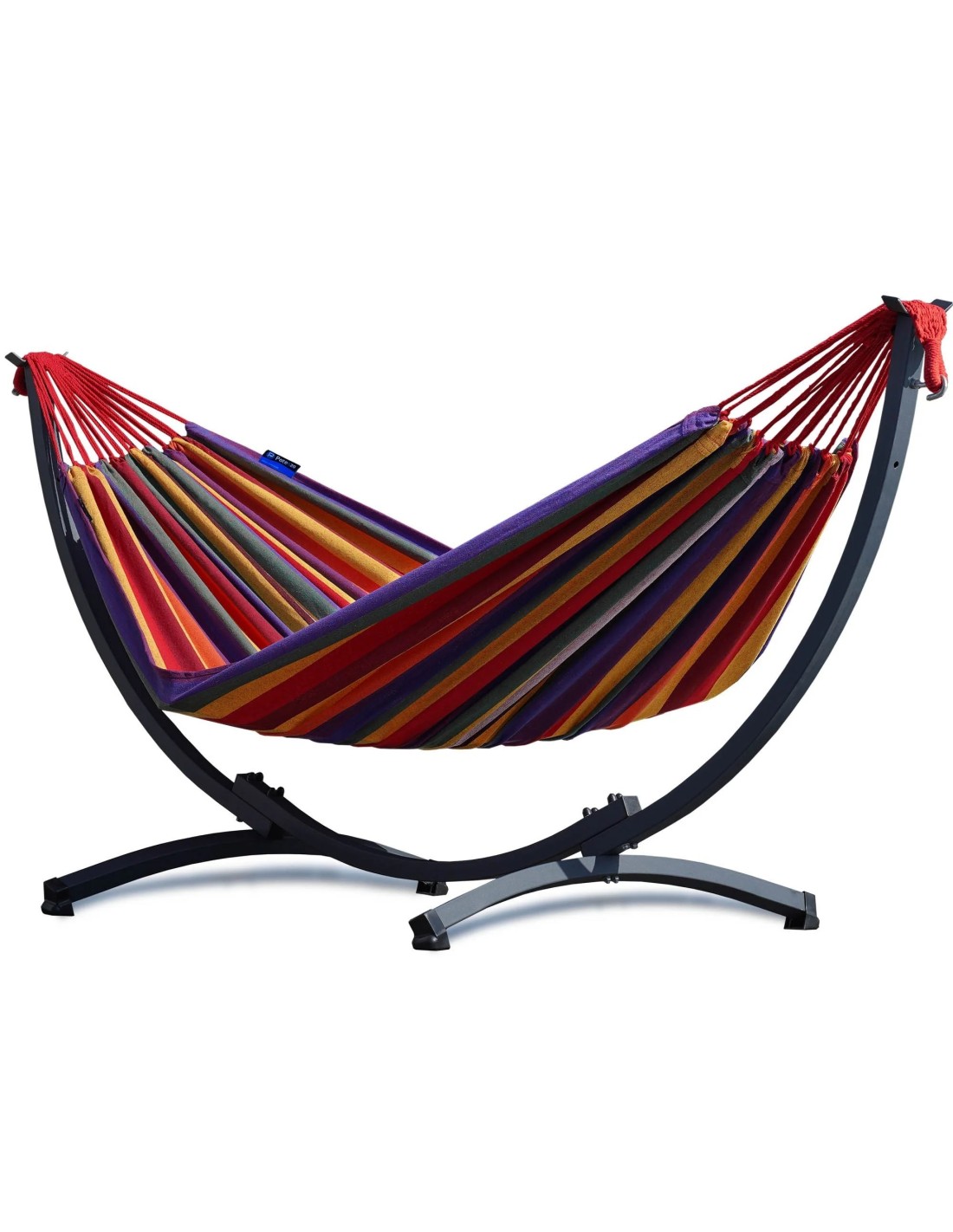 Die Hängematte kann überall aufgestellt werden – ganz ohne Bohren oder Bäume. Dank des Gewichts von nur 17 kg lässt sich das Gestell leicht versetzen.