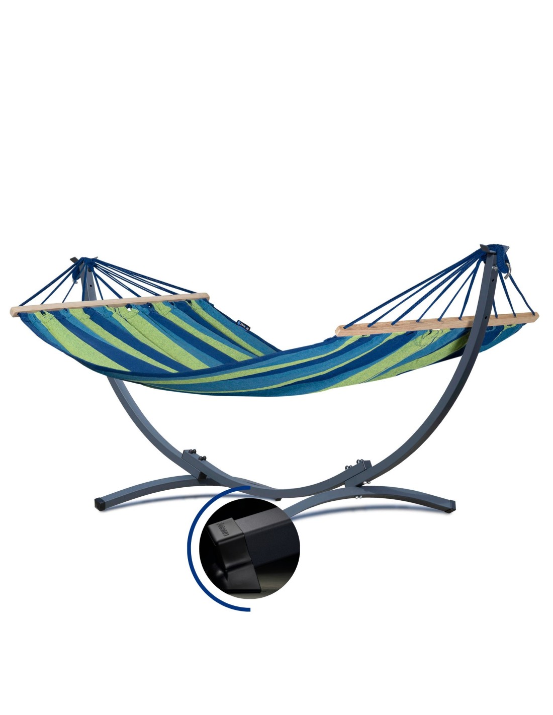 Die Hängematte kann überall aufgestellt werden – ganz ohne Bohren oder Bäume. Dank des Gewichts von nur 17 kg lässt sich das Gestell leicht versetzen.