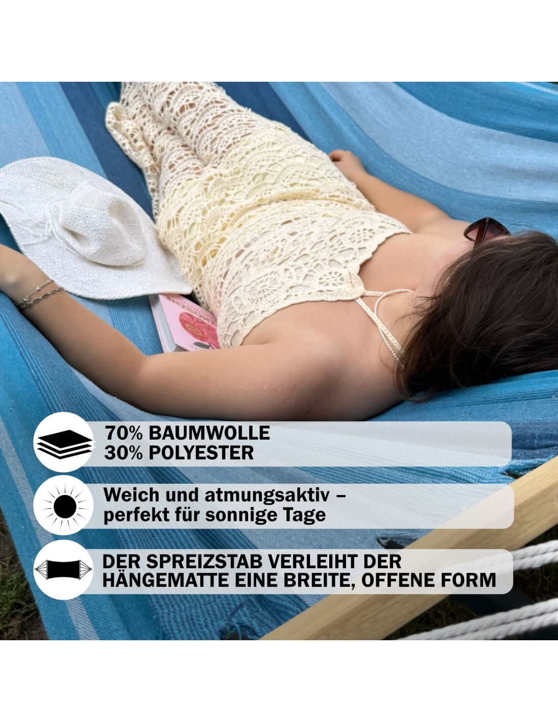 Mit einer Liegefläche von 200 × 120 cm bietet die Hängematte den idealen Platz für eine Person, um sich zurückzulehnen, zu lesen oder einfach zu entspannen. Die stabile Konstruktion trägt zuverlässig bis zu 120 kg.