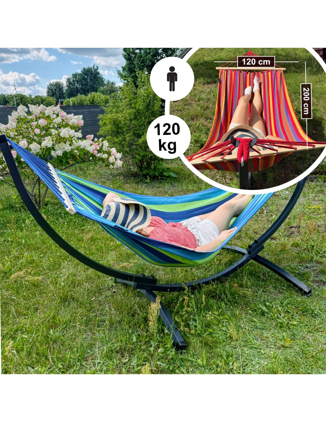 Hängematte mit Gestell I Stabiler Rahmen 200kg - 250cm Balkon I Stabhängematte 200x120cm I Indoor Outdoor