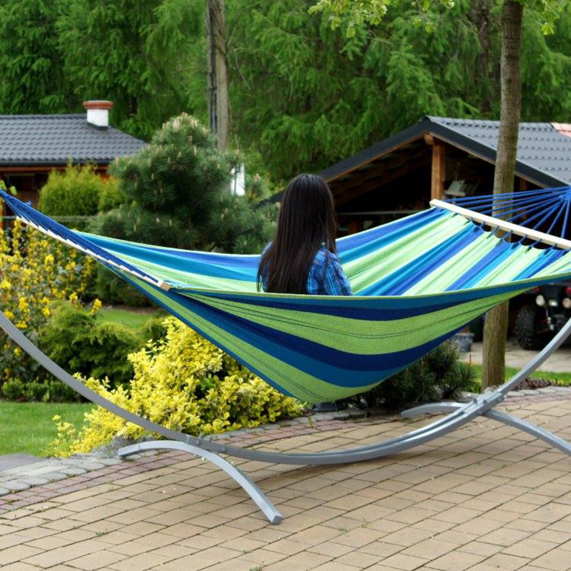 Du stellst Deine Hängematte genau dort auf, wo Du entspannen möchtest – im Garten, auf der Terrasse oder sogar im Haus. Ganz ohne Bohren und ohne Bäume.